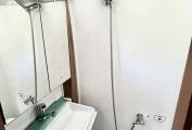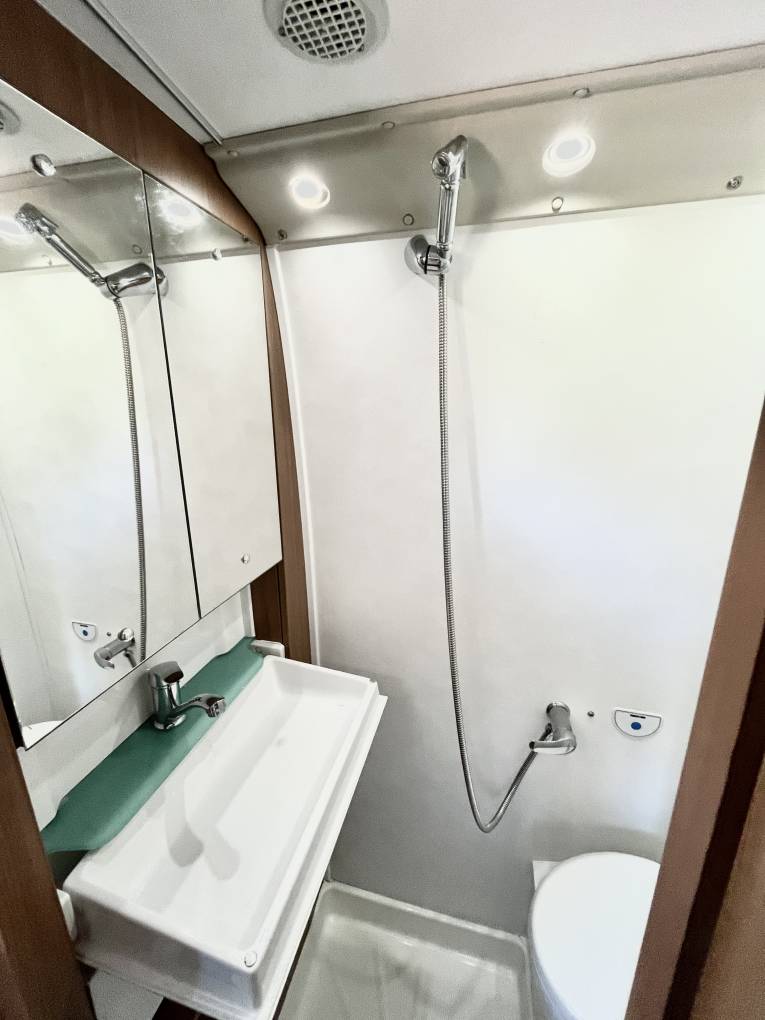 Further into the van we have the galley style kitchen complete with three burner gas hob, combination oven / grill, fridge with freezer compartment, sink with hot/cold water and storage both above and below. Opposite the kitchen area is a good sized washroom with electric flush toilet, shower and drop down sink with mixer tap.