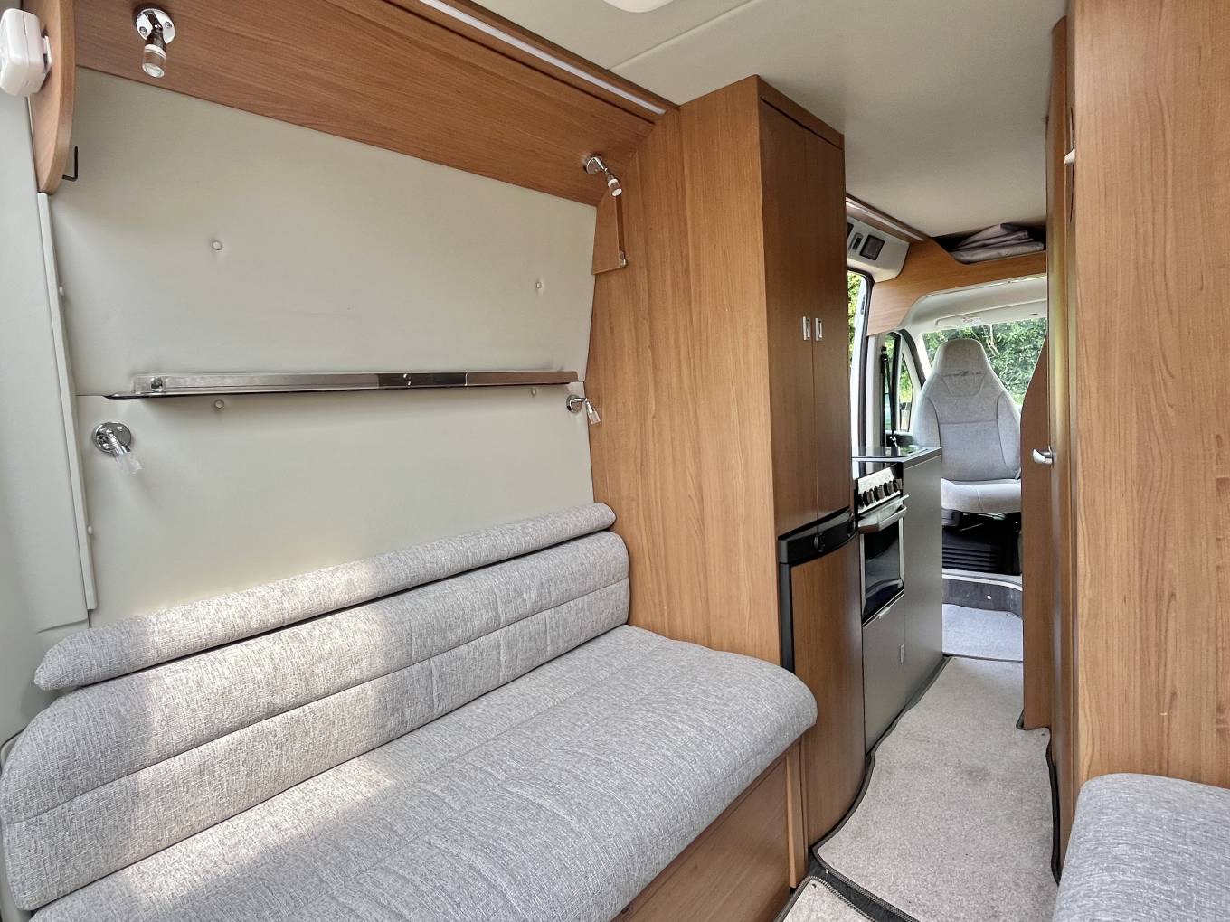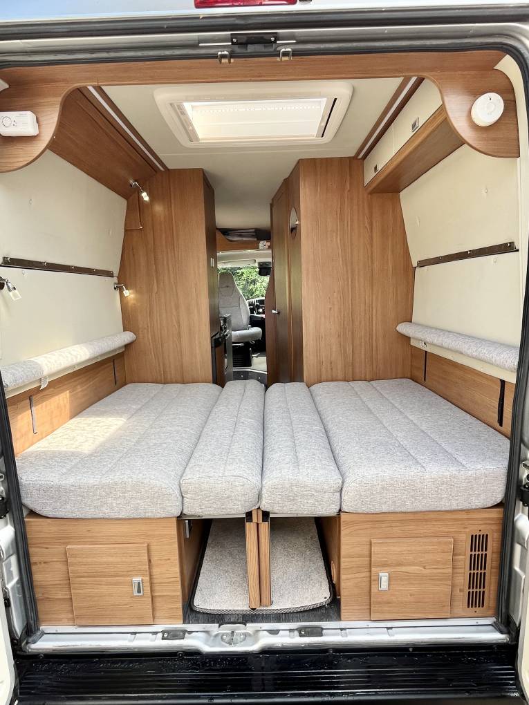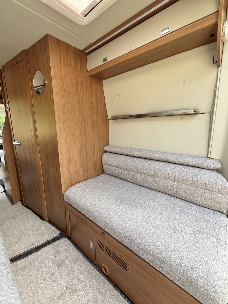 At the rear of the van we have a twin sofa rear lounge and socialising area which can quickly and easily be converted to a rear bed, there is also an option for a second double bed above the lounge area. Both sofas have a storage area underneath and there is a large cupboard / hanging wardrobe area.