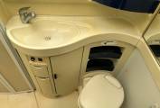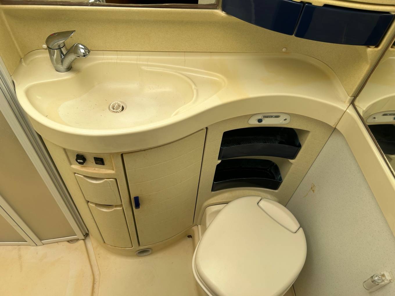 Wash-room has a separate shower, wash hand basin, cassette toilet and a vanity mirror. Lots of storage here.