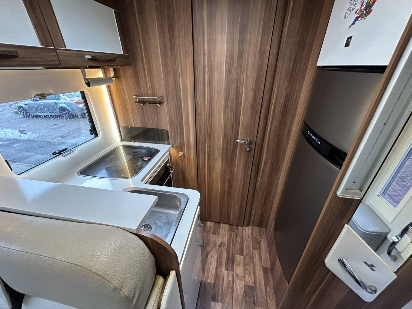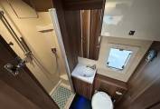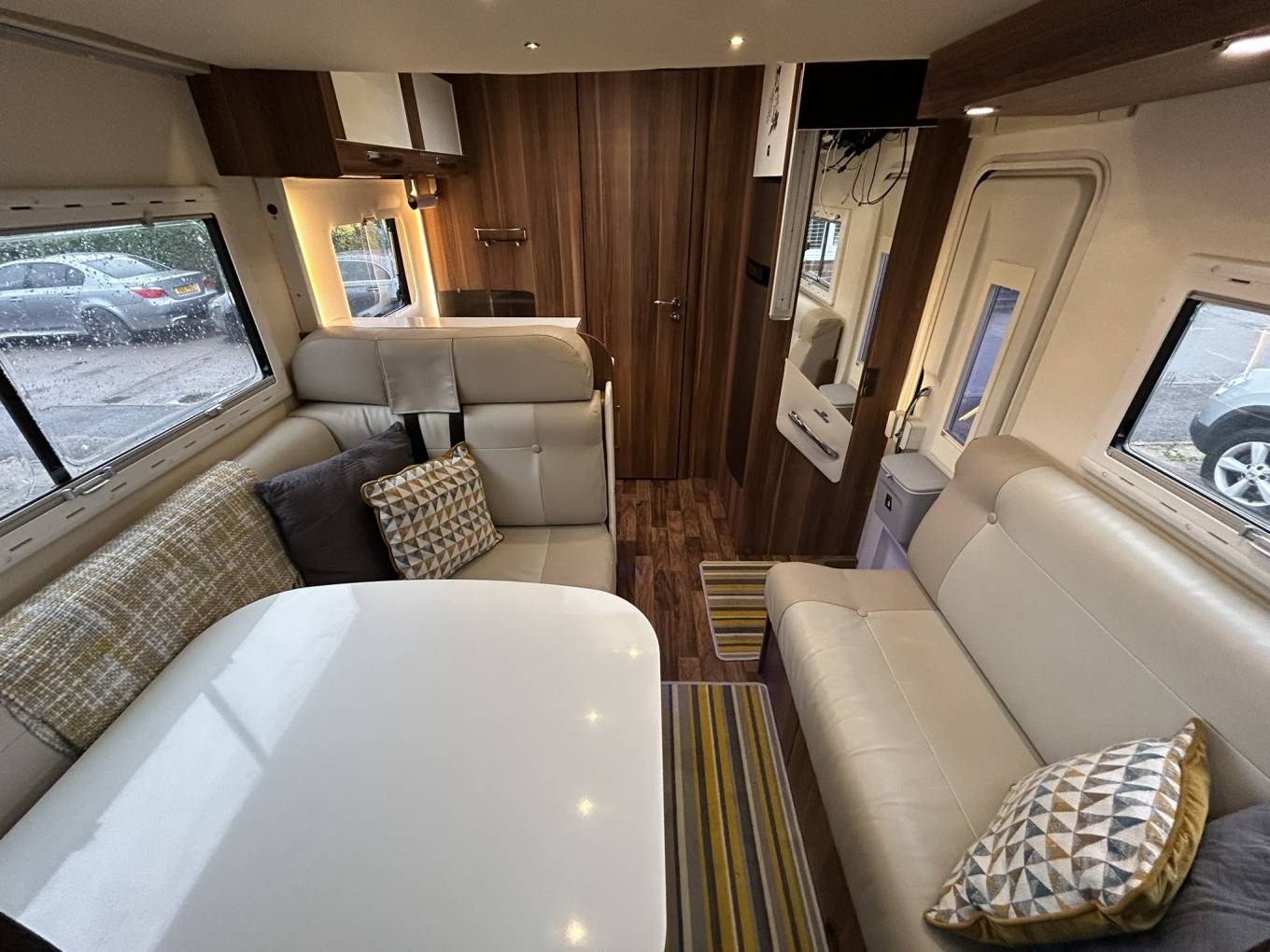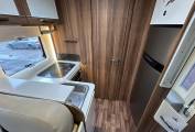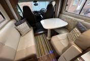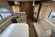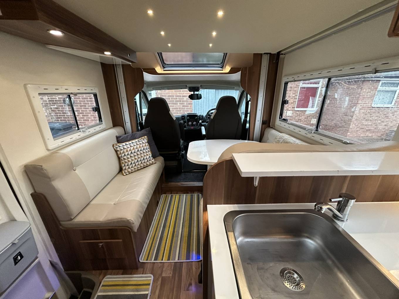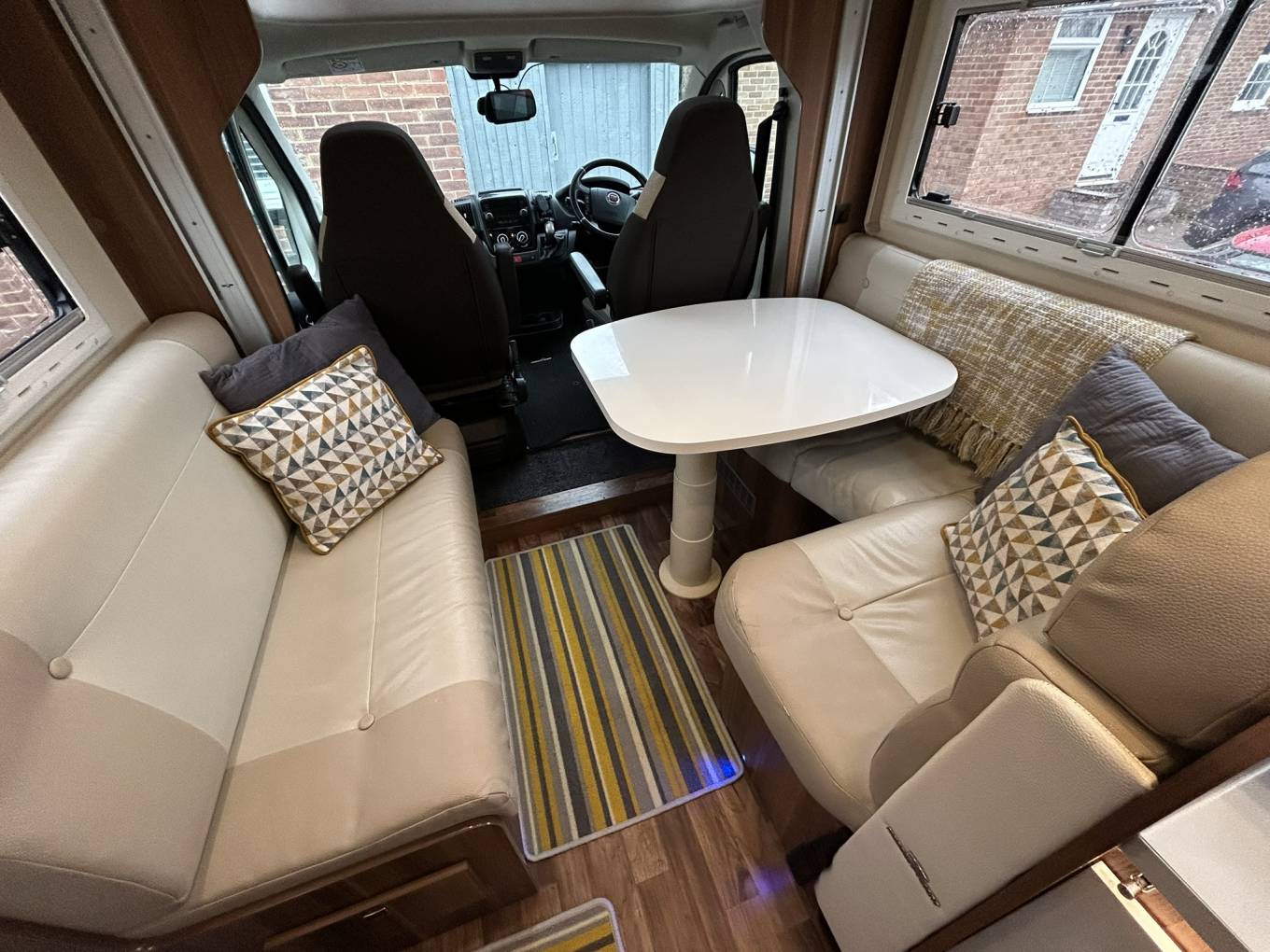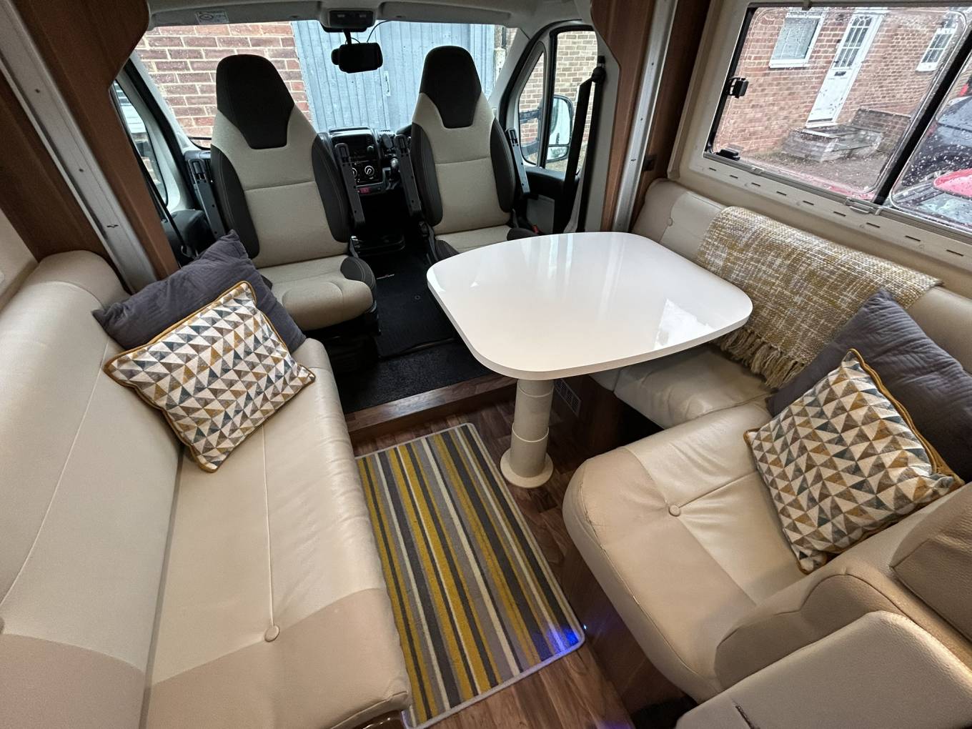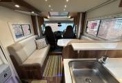 Inside, the motorhome features a modern kitchen with a gas hob, oven/grill, fridge-freezer and sink, along with plenty of storage. The lounge area is bright and welcoming, with a dining table and swivel cab seats. The washroom includes a cassette toilet, wash basin and shower.