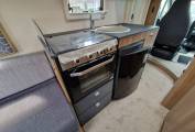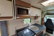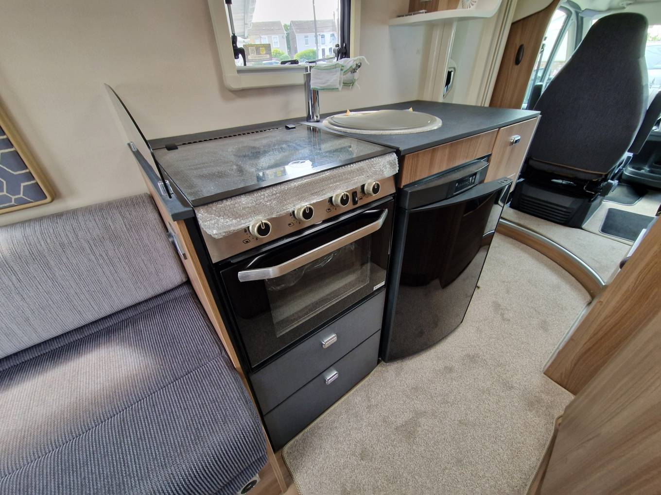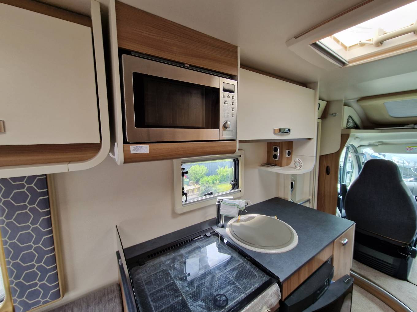 The galley is in the centre of the ’van, along the nearside, and here you immediately notice an advantage over a (narrower) van conversion with a similar layout. The aisle between the washroom and kitchen is not as restricted. Spec includes a Triplex cooker with oven/grill, plus a sink with removable drainer and a high-level microwave. There’s plenty of worktop, even before you use the folding flap by the door and this is completed by the 85l fridge.