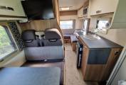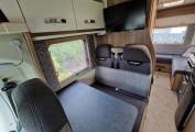 Remarkably for a compact motorhome, there is enough room for a dinette up front, with a pair of belted seats – so you can travel with four people on board, making this an ideal ‘van for running children around in before they pitch up a pup tent and sleep outside. Alternatively, you can use the dinette as somewhere to eat and leave the bed up permanently – ideal if you’re planning to arrive on site late at night and don’t want the hassle of making up a bed.This area also has a TV with satellite system.