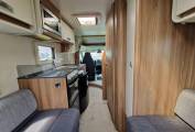 Entering the van from the hab door on the passenger side, we turn right to go to the superb end lounge which is a cosy space for two or four, with triple aspect glazing and a small rooflight above. There are good-sized top lockers here, too, and good bedding storage that’s easy to reach under the nearside sofa. Recessed lighting is fitted under the upper cupboards. This also converts to the sleeping area and this process is extremely easy to convert the parallel rear benches into a 1.92m by 1.28m double bed. The seat bases just pull together – no flimsy caravan-style bed slats here! And trim panels at the side walls mean that your pillows don’t touch the walls.