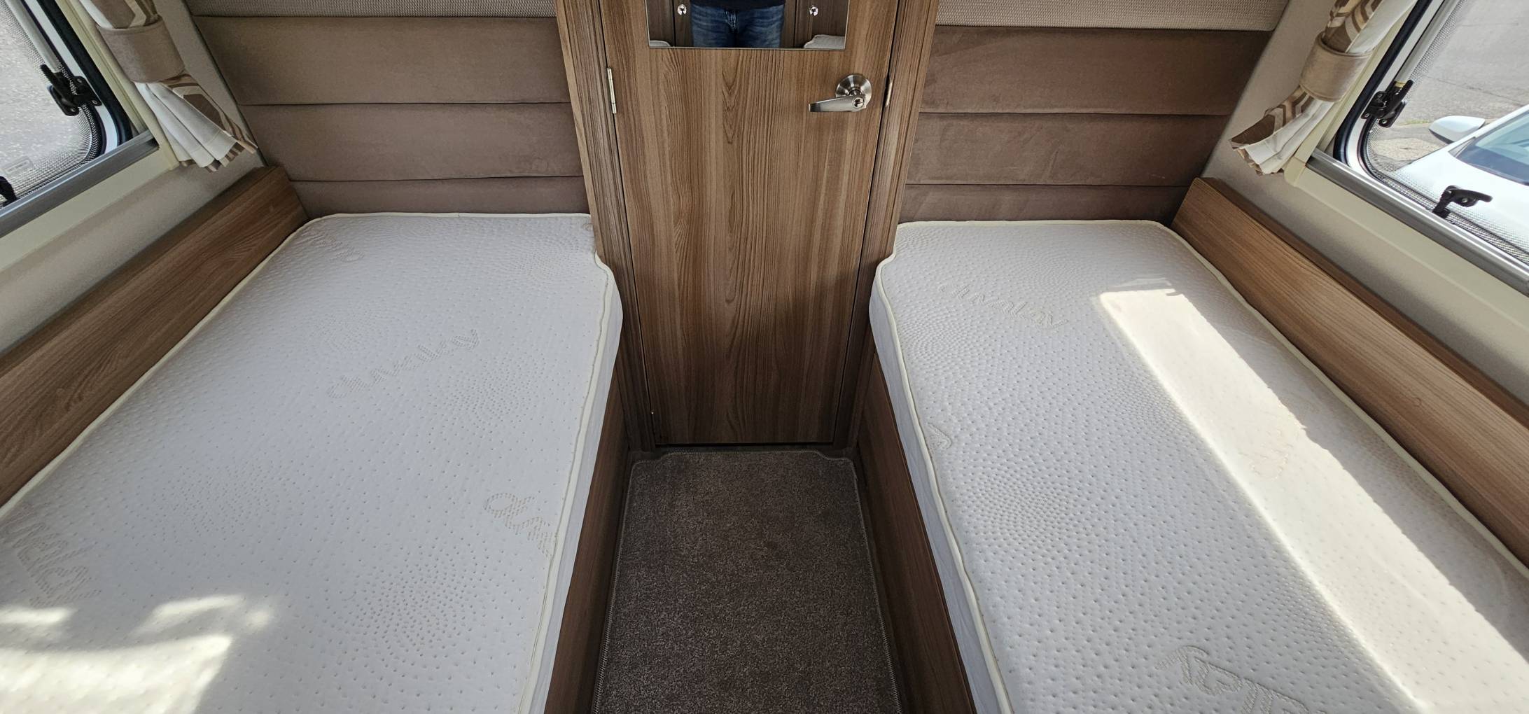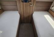 Two single beds can be partitioned off from the front of the motorhome, featuring plenty of overhead storage and wardrobe space. The bed sizes are 2.01 metres by 0.75 metres, and 1.92 metres by 0.75 metres.