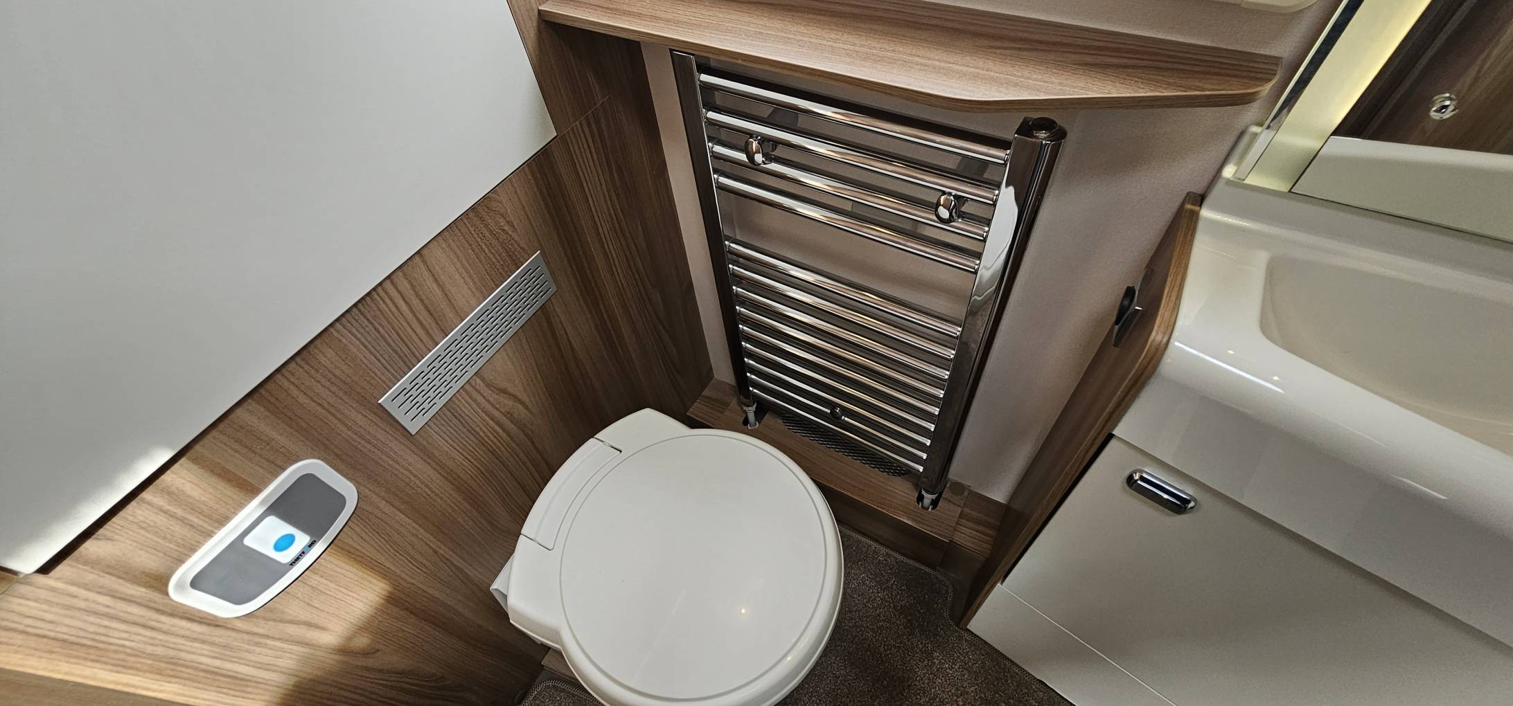 At the rear, a sizeable washroom provides a large amount of room, keeping the toilet and the shower section separate from one another. A wash basin and large vanity unit also feature.