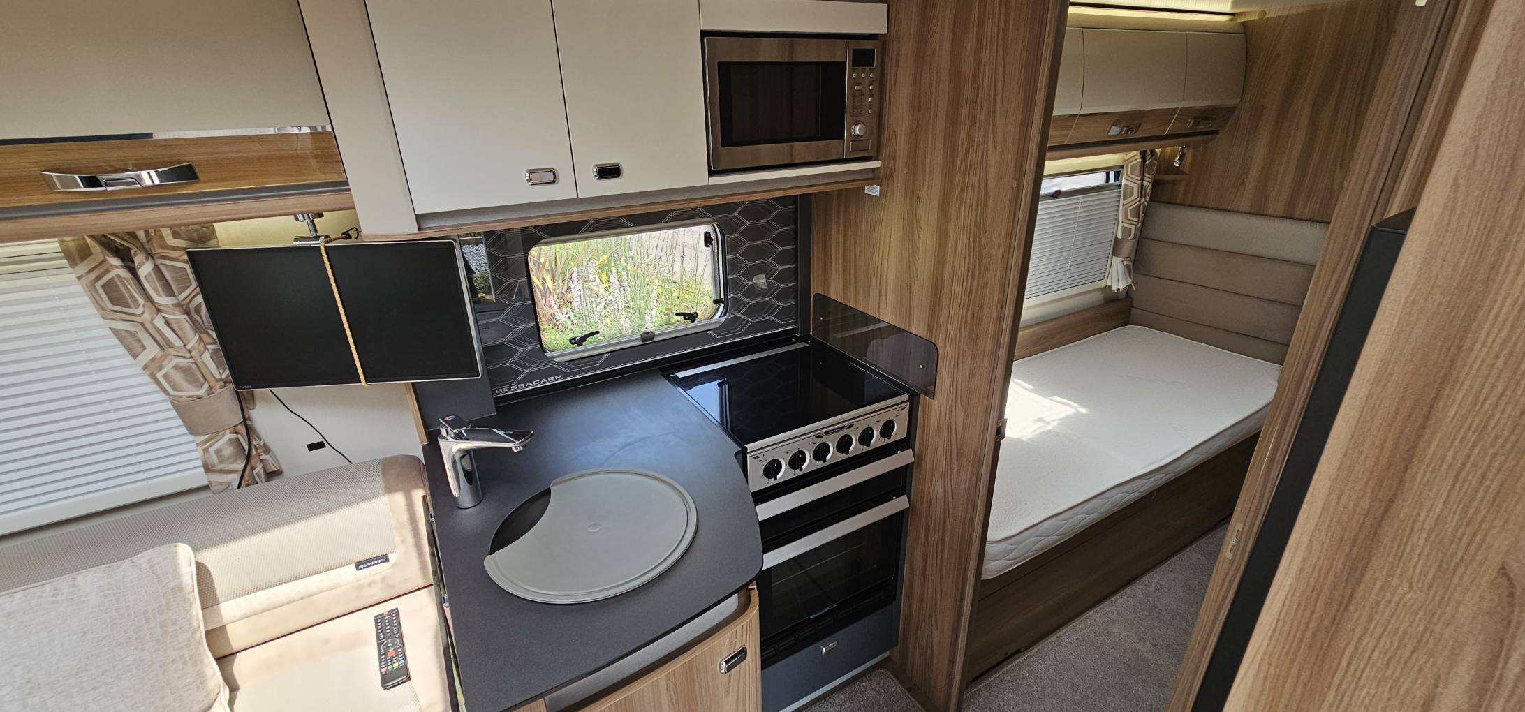 A generously sized kitchen features behind the lounge featuring gas hobs, 138 litre fridge with freezer compartment, oven, grill, microwave and sink with draining board. Plenty of room also features for crockery, condiments and cutlery.