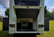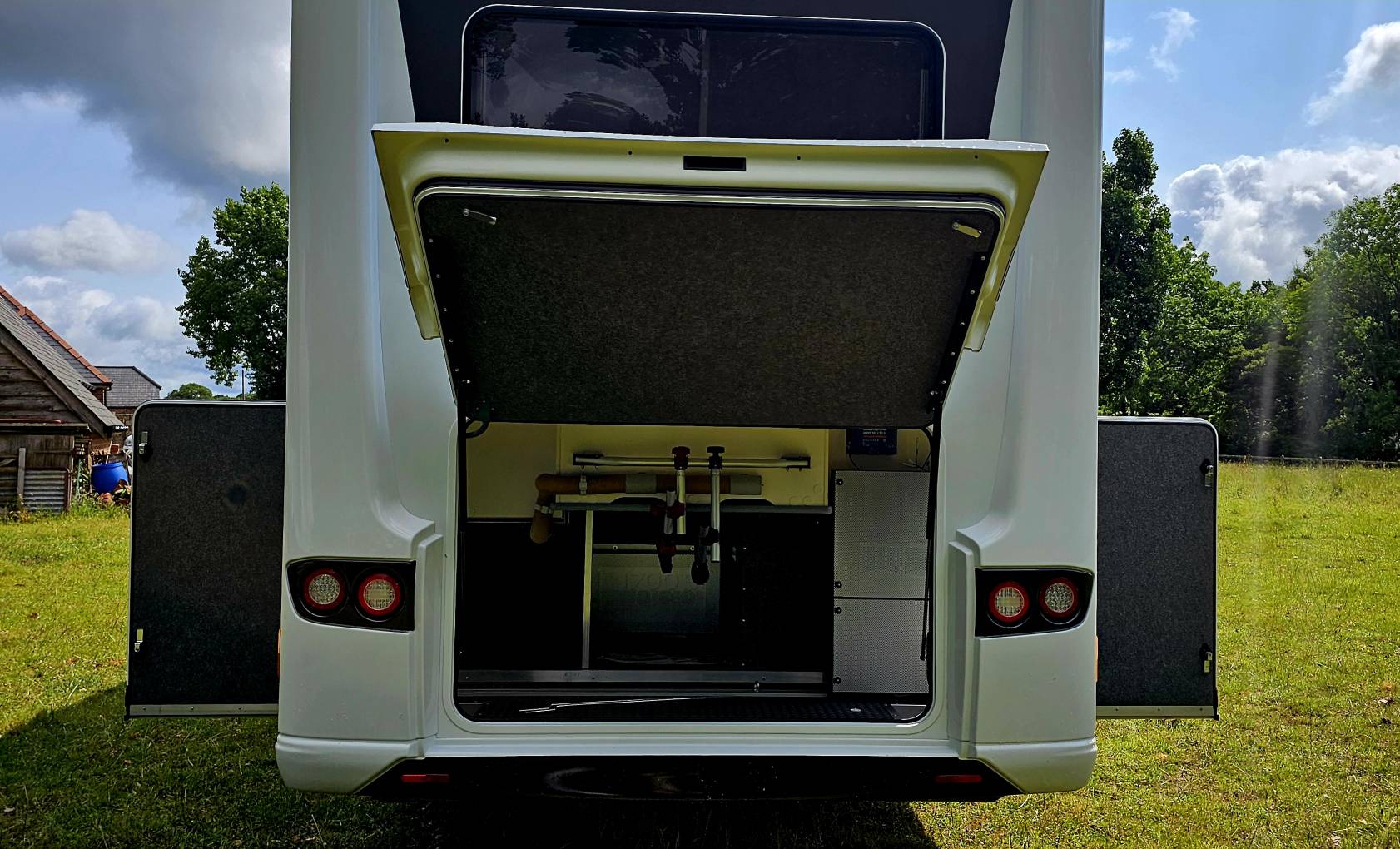 Driver's side: Transverse locker hatch (with spare toilet cassette). Storage locker for hoses; 240V hook up point; Toilette Cassette locker; access for Truma Boiler; diesel fill point.