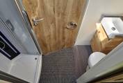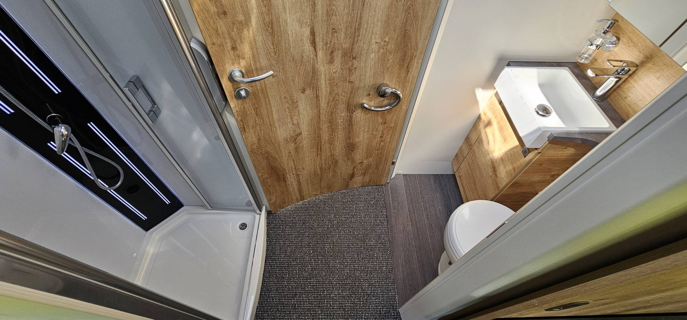 Moving Forward is the bathroom area with a good sized shower to the right and Toilette & sink opposite. Both are well lit and have a good feeling of space. They have a contemporary feel with a pedestal style wash hand basin with flush fitting chrome mixer tap above. The toilette is a Thetford Fresh water flush with a swivel top. There is a door that closes off to the rear and a sliding door to the front so you can make a very private area to get ready in the morning.