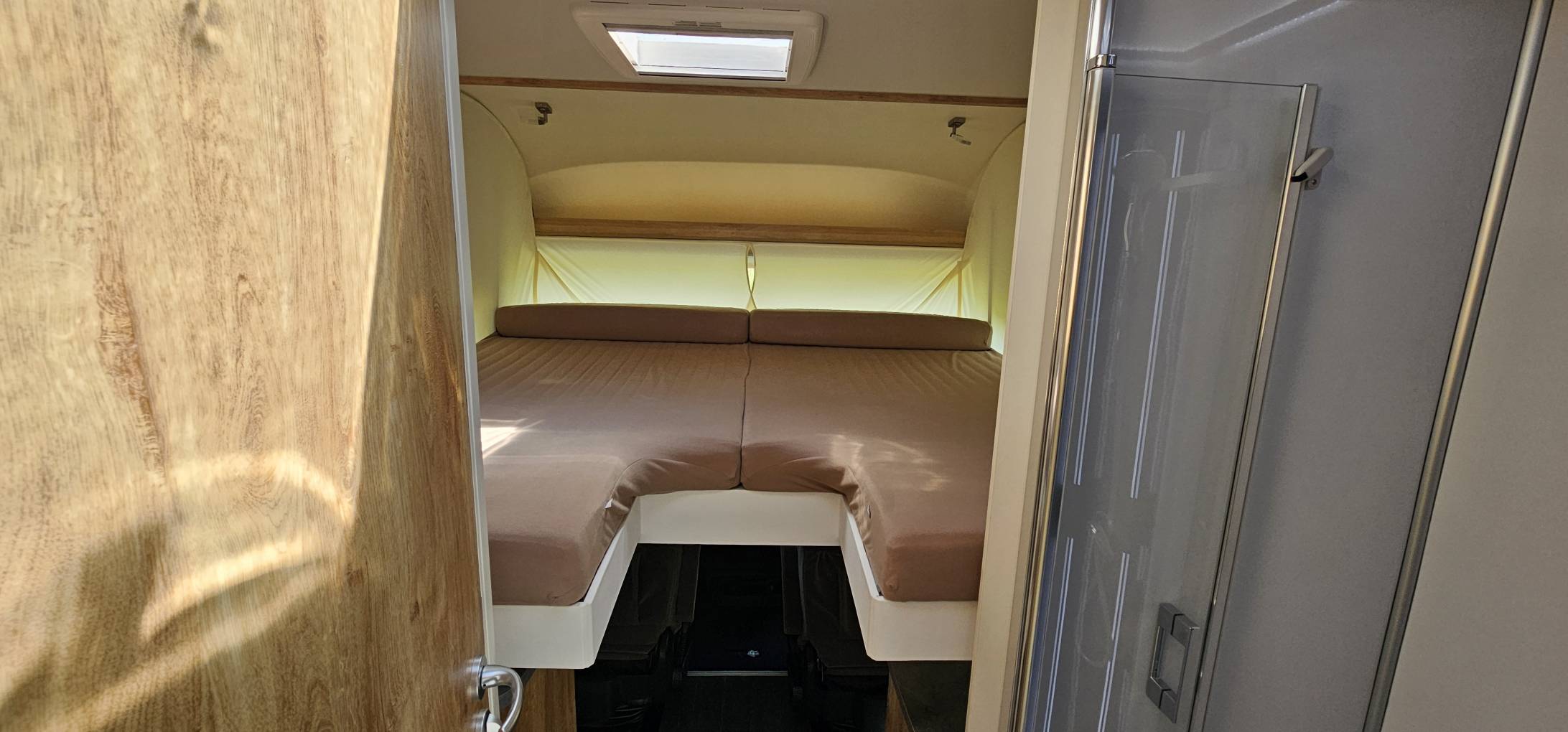 Moving forward again there are cupboards either side just before the cab, on the drivers side a step slides out from below so making ease of access into the bed above. The bed lowers electrically and is configured as twin single beds..