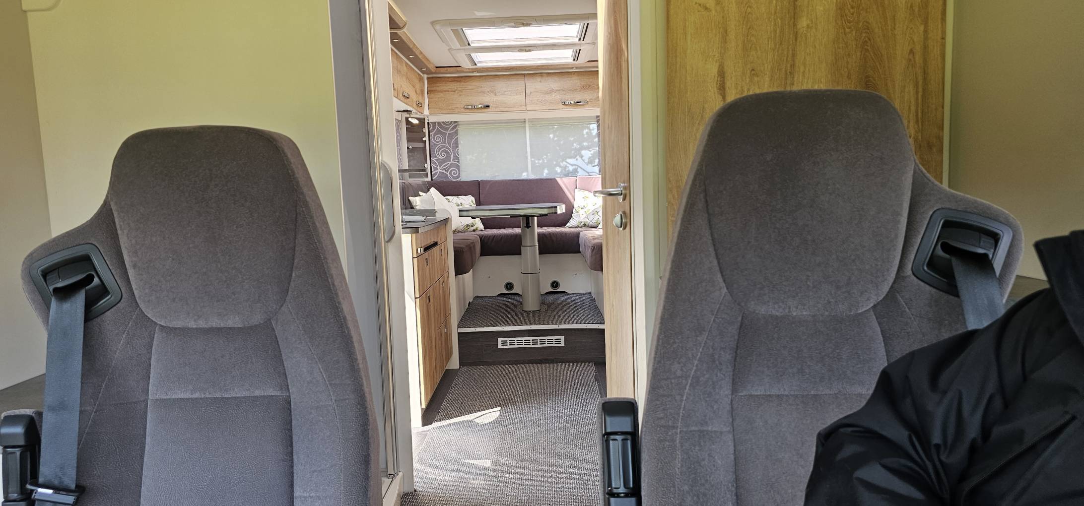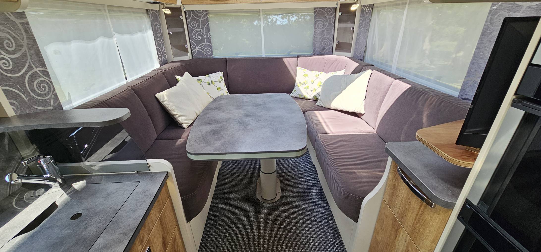 We enter the motorhome on the passenger side via an electric step immediately opposite is a large wardrobe with fixings for the occasional table below. The Kitchen area immediately to the left consists of a Full size Dometic oven & hob. It has four burners, 3 gas & one electric for when you are plugged in to the mains on site. To the right is a good sized oblong sink with chrome mixer tap that extends as a rinsing aid. There are plenty of cupboards and drawers for all your cooking utensils. Opposite is a large absorption Dometic fridge with separate freezer compartment, this can be operated in fully automatic mode so will switch between Gas; 12v and 240v depending on whether you are wild camping or plugged in on site. Above the fridge is a small oven & grill.