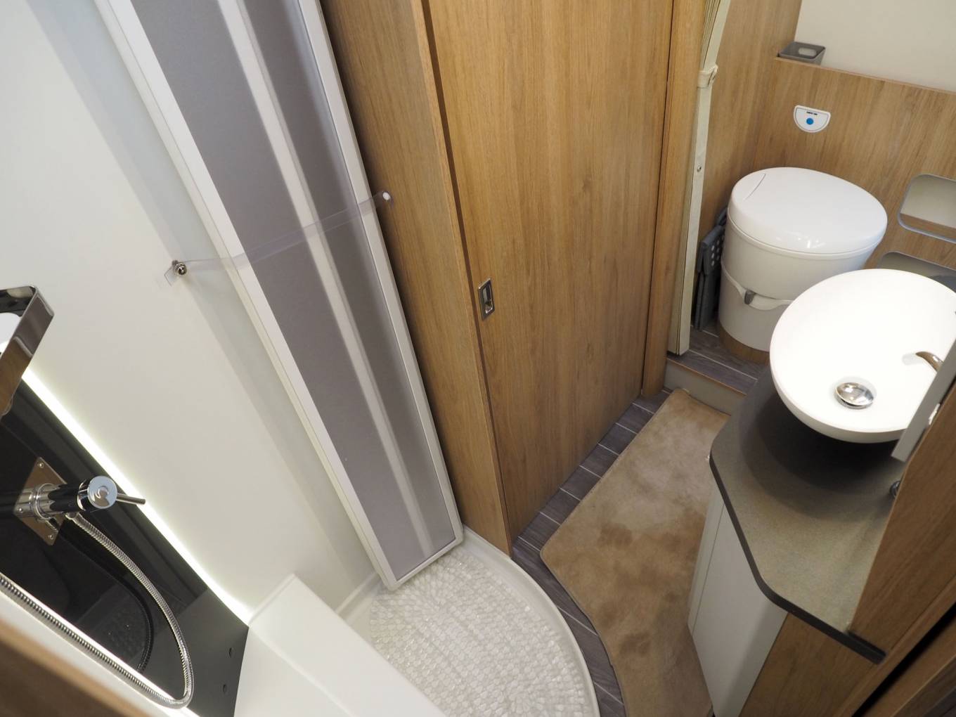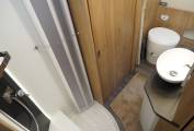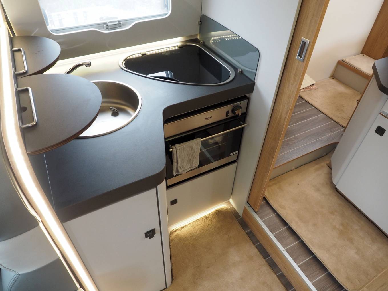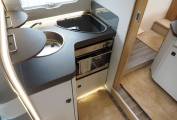 Essentially the classic zoned layout comprises of a light and airy forward dinette, centre kitchen and washroom, with a rear height adjustable island bed over a garage. The dinette features a multiposition table and the double bed above lowers electrically, having protection nets and access ladder. The kitchen is very well equipped with large fridge freezer, gas hob, oven and grill, plus a range of drawer and locker storage. The washroom including the separate shower cubicle can be partitioned off from the front or rear for privacy, while the bedroom offers twin wardrobes either side of the large island bed. The 230v habitation air conditioner is roof mounted centrally for efficient cooling. Other onboard facilities include fresh and waste water tanks, dual fuel heating and hot water, copious lighting and storage, USB points, multifunction TV DVD combo.