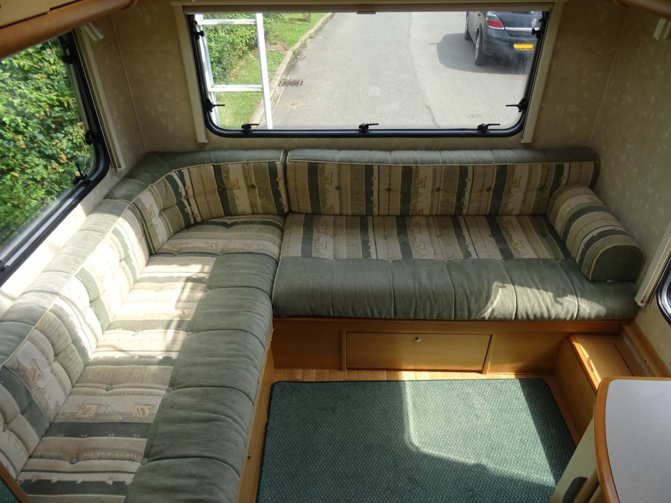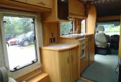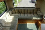 At the rear is the panoramic L-shaped lounge with a large vertical nearside feature window. A solid foldaway table easily sets up for dining and the transverse bed is also easy to make up as is the front over cab double, which can also double up as a huge storage space if needed.