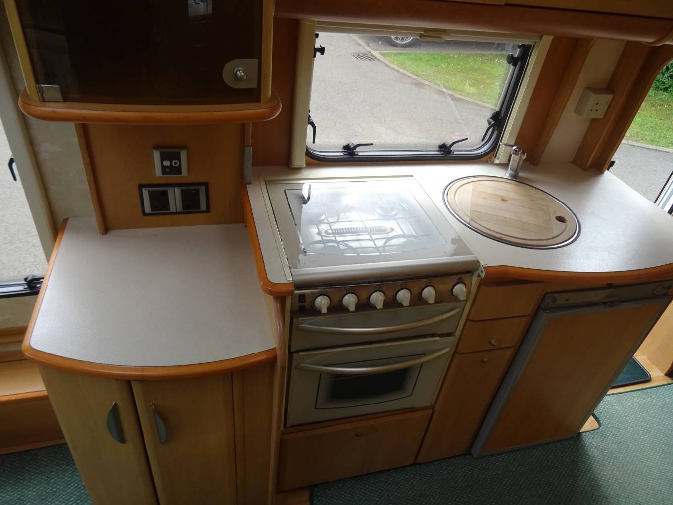 The kitchen is well equipped with a 4 gas burner hob, oven, grill, 3 way fridge with freezer box, sink and mixer tap and adequate work top and storage areas. Opposite is a large hanging wardrobe and the washroom, comprising of a hand wash basin, swivel seat electric flush toilet, shower and storage cabinets.