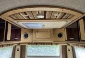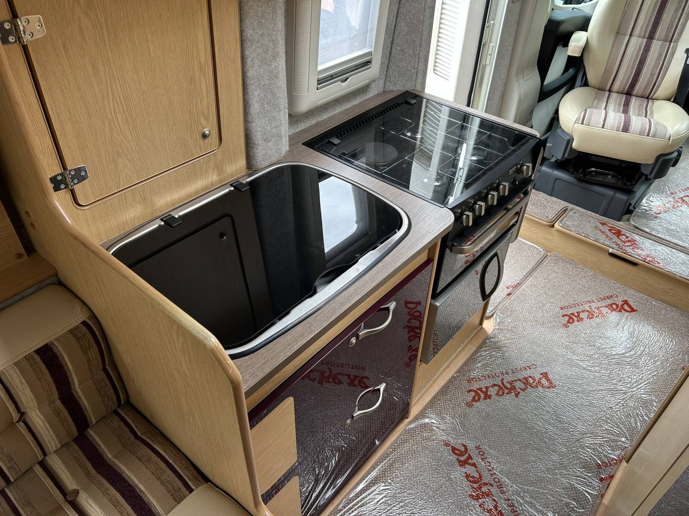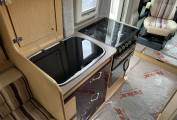 As you enter the van you immediately drawn to luxurious rear U shaped lounge, with its half leather/fabric upholstery, giving you space to relax and entertain. At night this converts into a large double bed or two good sized single beds. Above there is plenty of locker space, a roof light that floods the van with natural light and a TV cleverly hidden in its own cupboard.
