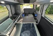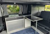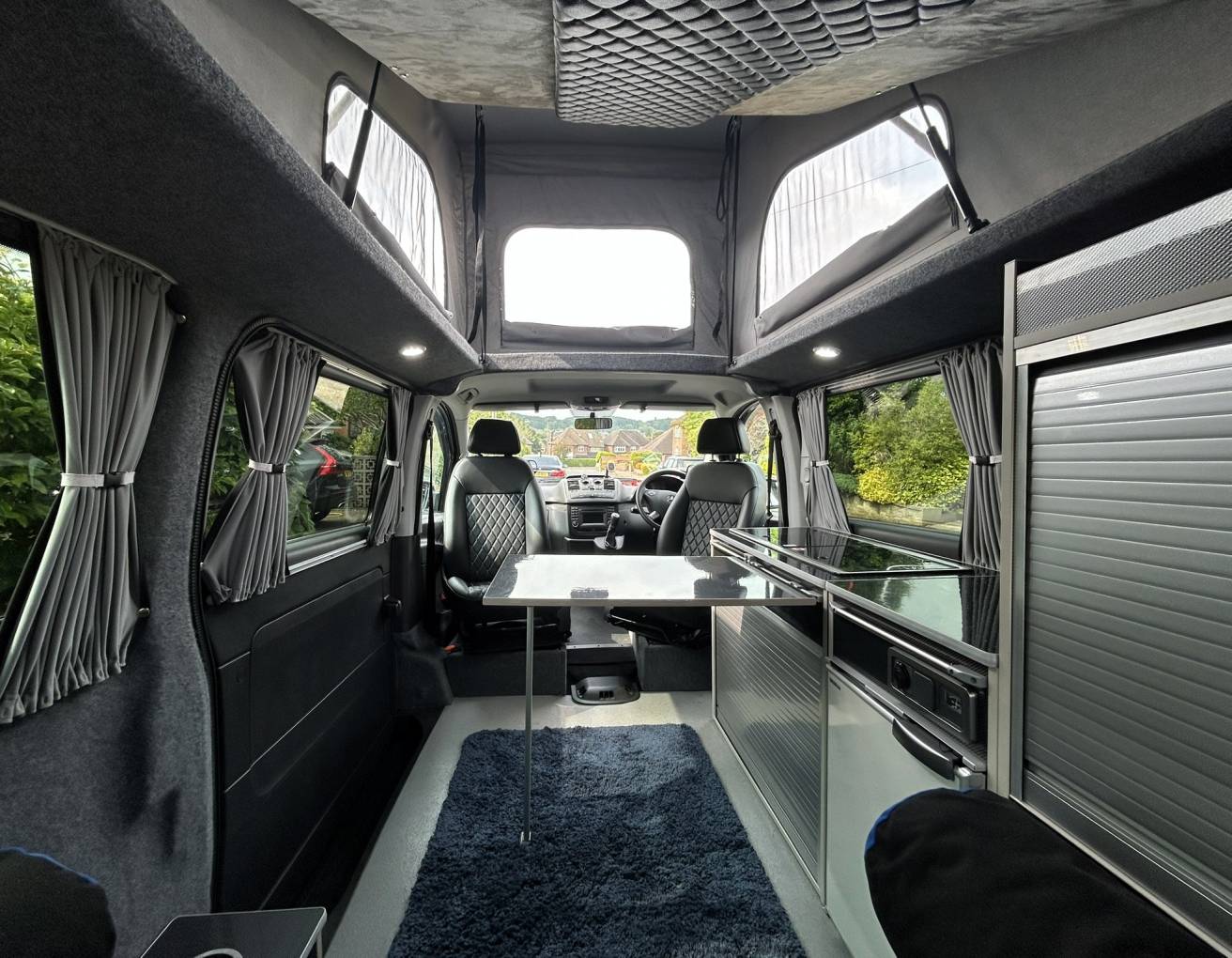 The layout of the camper consists of twin swivel seats, sliding doors on both sides allowing 360-degree views, a Rock & Roll bed with topper mattress , pop top roof, kitchen area with sink & cold water and 2 ring gas hob which can be detached from the vehicle and used for outside cooking, fridge freezer, well-proportioned storage, and 4 travelling seatbelts.