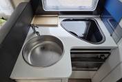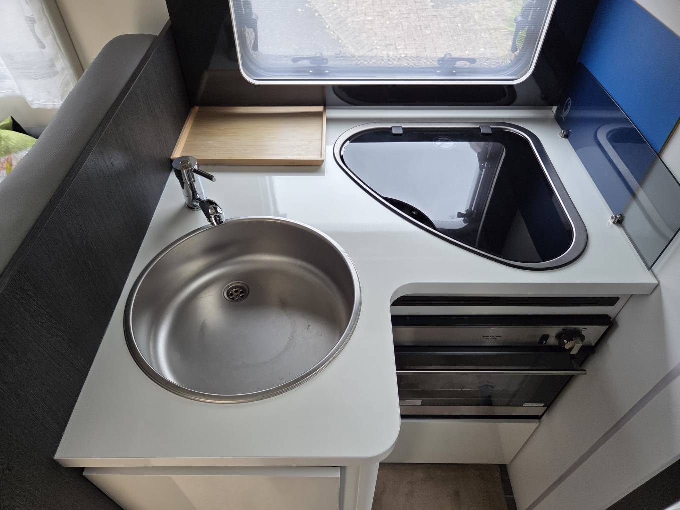 The kitchen is well-equipped with a three-burner hob, oven, large fridge-freezer, and ample storage, making meal prep easy on the road.
