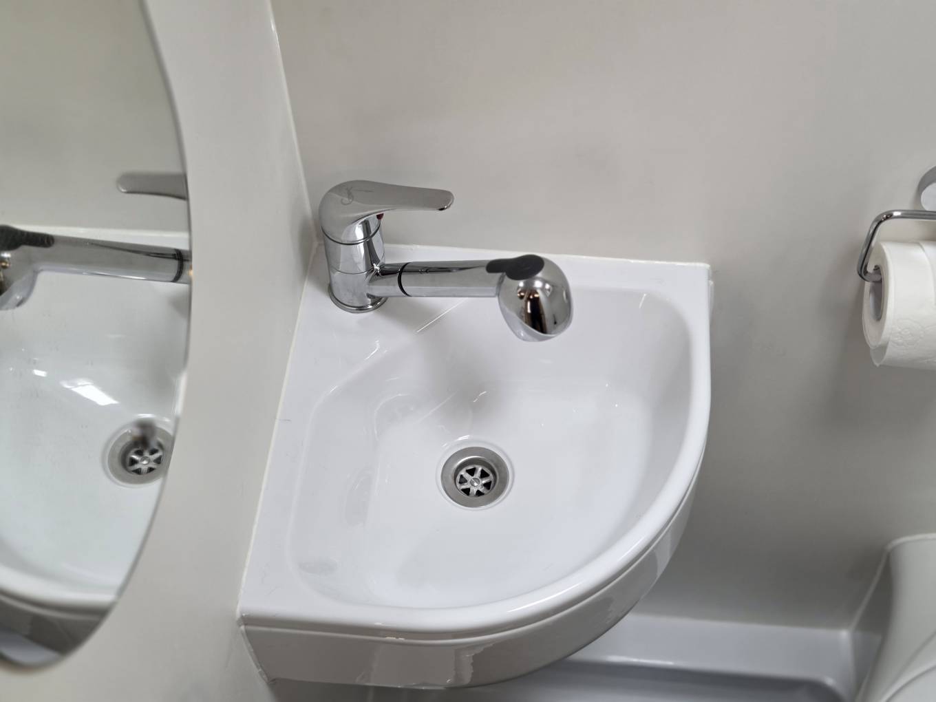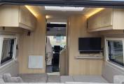 In addition to a well-appointed shower room for your convenience with a Thetford electric flush toilet and wash-hand basin, this luxury motorhome also has a front fold-out bed that allows easy access to the facilities.