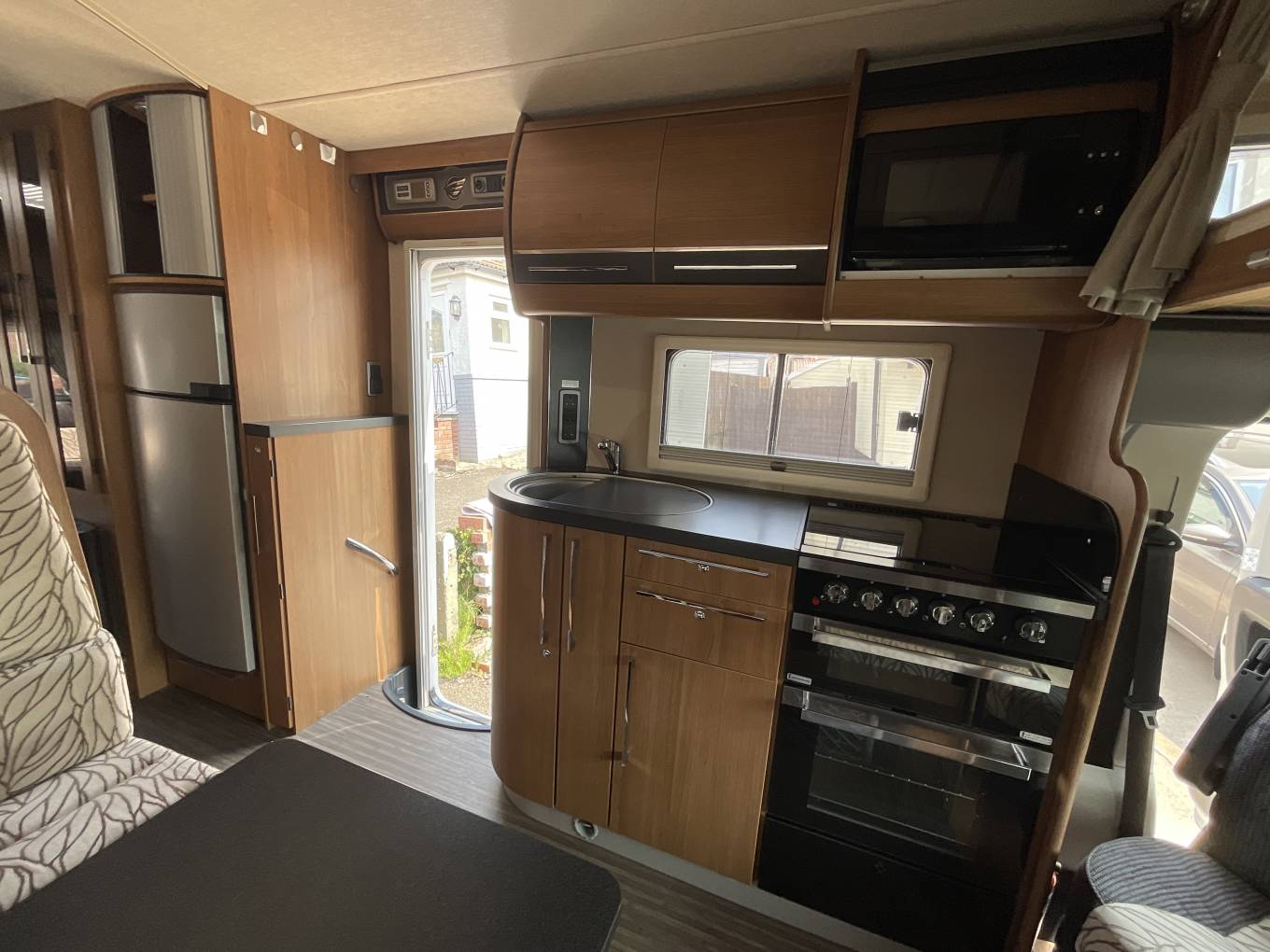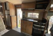 Opposite the dining area is the kitchen featuring a dual fuel hob with 3 gas burners and 1 electric hotplate, an oven with grill, a large 190 litre Dometic fridge freezer, a microwave, a sink and mixer tap and loads of cupboard storage space.