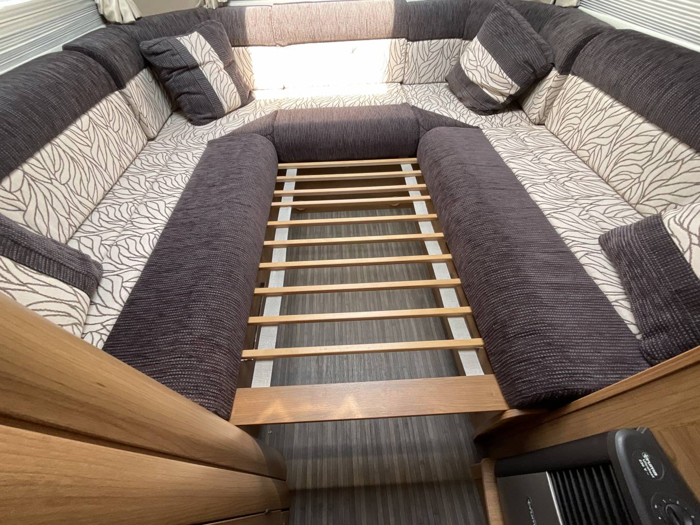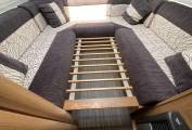 The U shaped rear lounge is large, bright and just a delight to relax in. The upholstery is finished in a pleasing combination and there is storage space underneath the sofas.