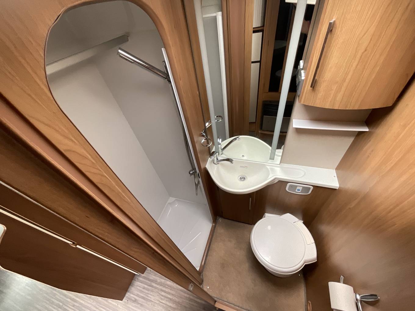 Moving forwards on the right you come to the very stylish bathroom with a separate shower and screen, toilet, basin and mixer tap and plenty of cabinet space.