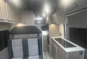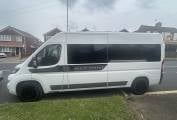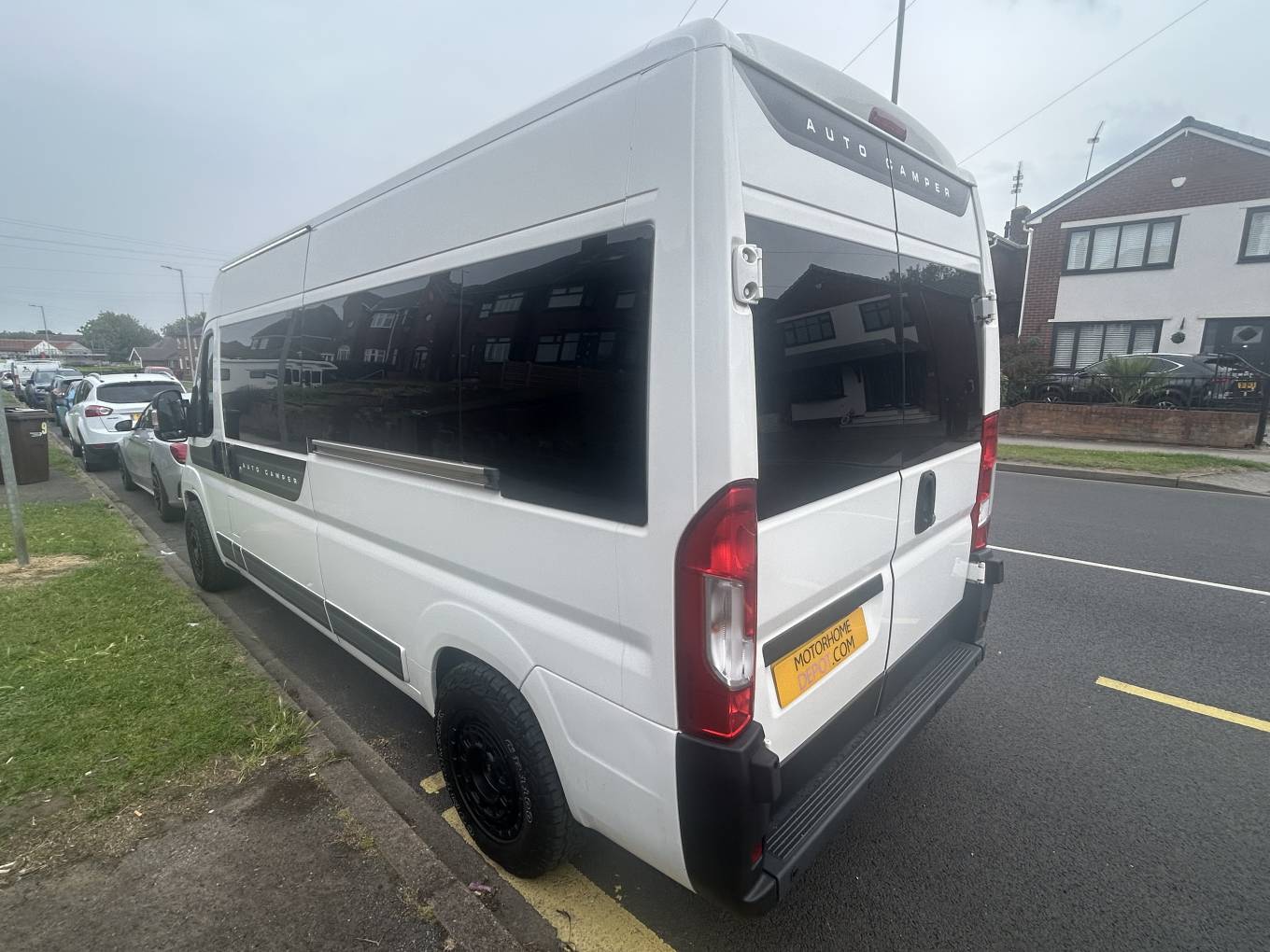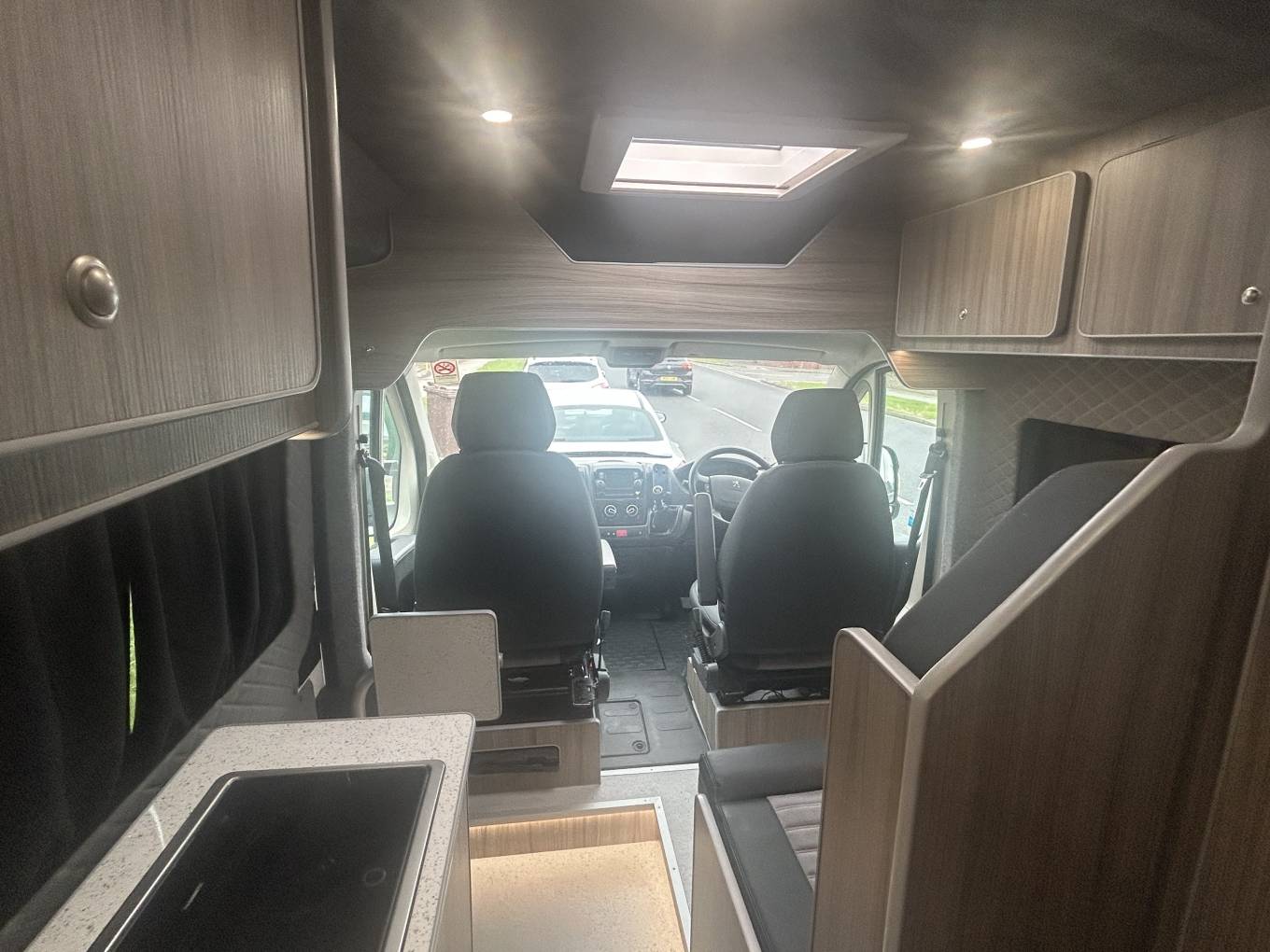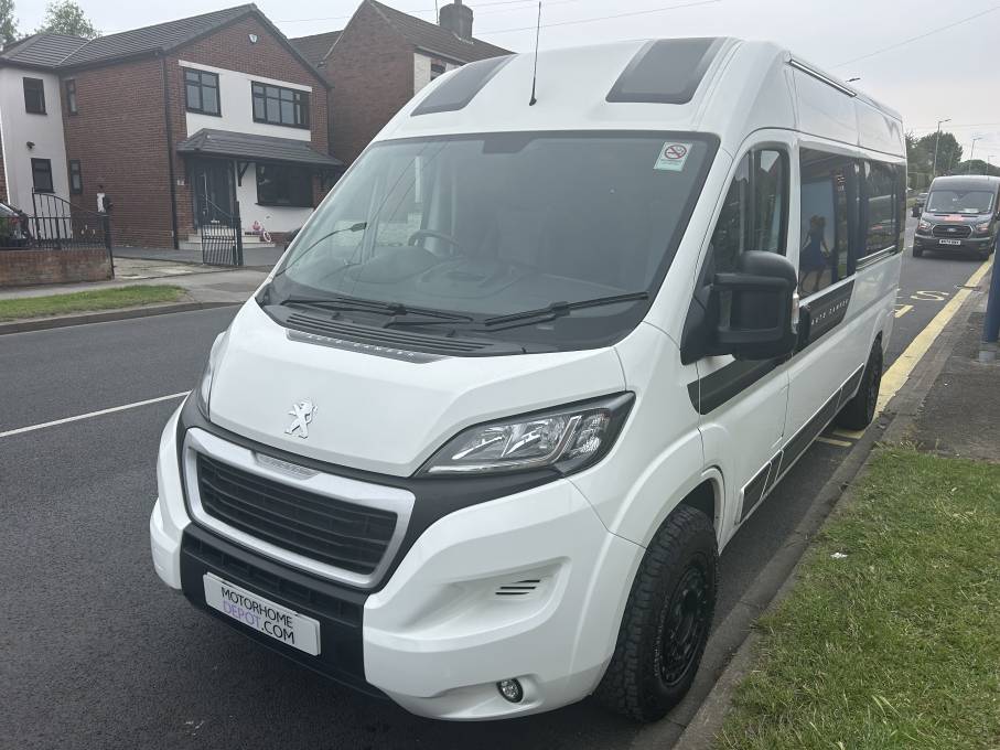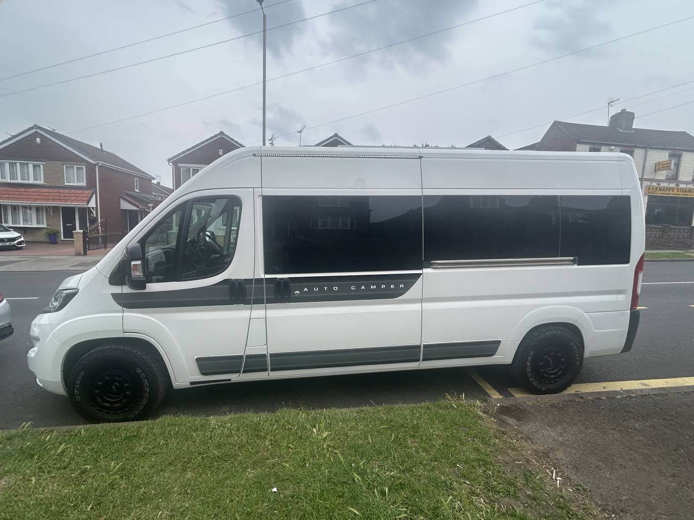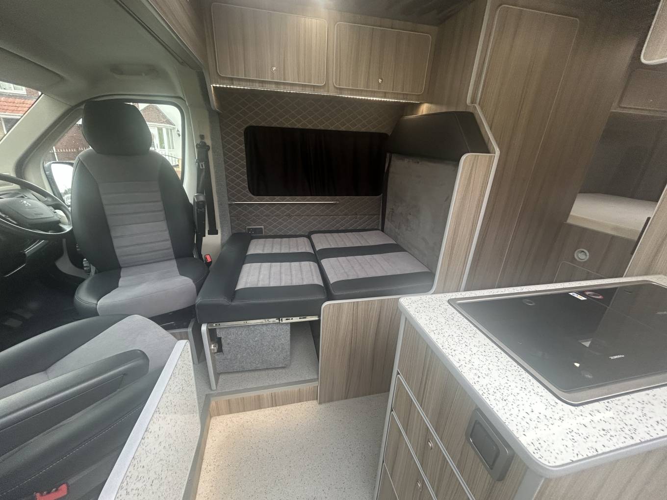 Here we have a Peugeot Boxer camper van professionally built by Ash Ben design and conversion LTD Sheffield, the conversion was added in December 2024, with just 39521 miles on the van. It has been converted to a high slandered with velvet cushioning on the walls and doors, the external panel windows have been added as an extra, the cab offers, cruise control, air conditioning, steering wheel controls, sat nav, both seats turn to create a great seating area to enjoy meals or simply relax, the seating is also to a high standard with the leather seats, silver stitching with fibre aqua protection, also with two forward facing seats with seat belts, which also makes into a small bed. The kitchen area has a two gas hob, sink and tap, plenty of storage, large fridge freezer. The wash room has the cassette toilet, shower, mirror and vanity unit. The bedroom has a large raised double bed. This motorhome comes with a solar panel to keep you topped up, stay comfortable with the 4e Truma heating and water boiler. Externally you have a large garage at the rear, access to the cassette toilet and 240v input. The off road tyres gives the camper a great look along with the artwork. This can be viewed in Rotherham by appointment only, finance and part exchange is available.
