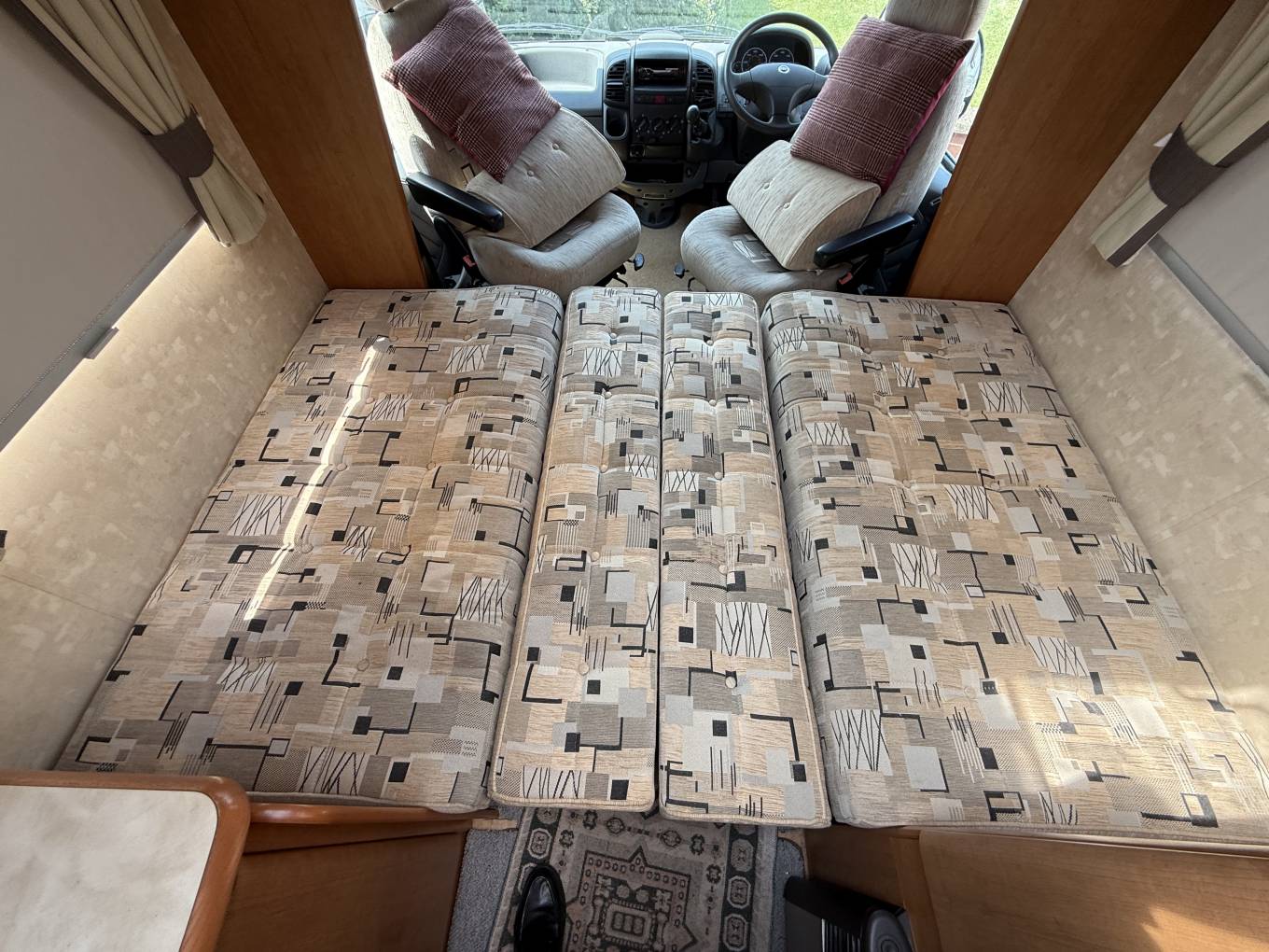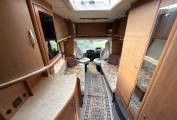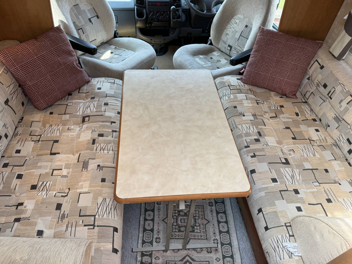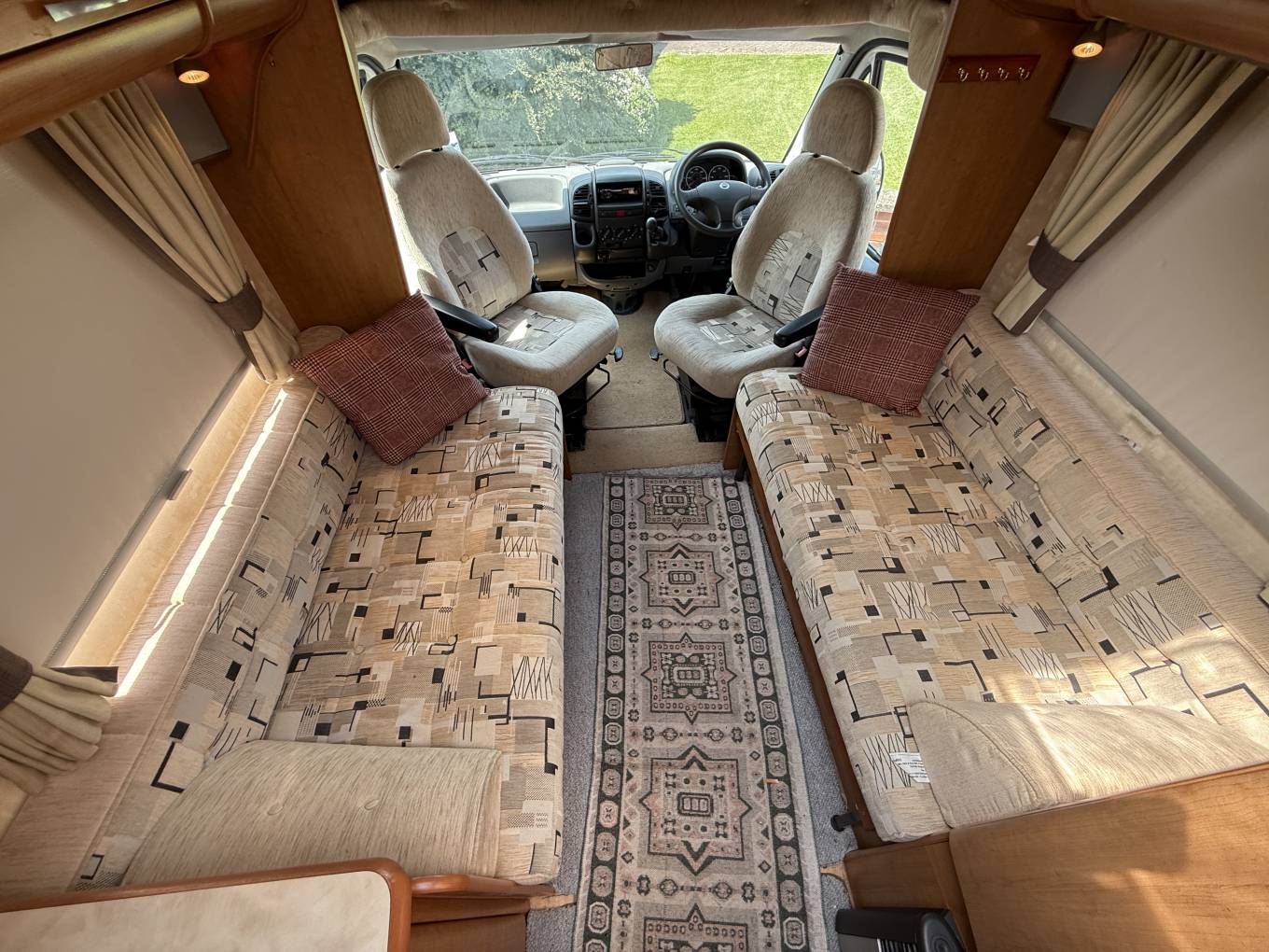 Across the centre of the motorhome is the lounge where two inward facing settees are complemented by twin swivelling Cab Chairs.