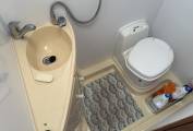 In the opposite corner is the bathroom consisting of a Thetford Flushing Cassette Toilet, a Wash Handbasin and a Shower Unit.