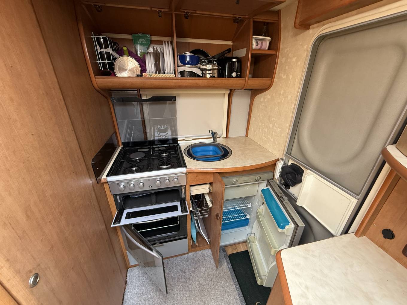 Here you will find a Three Gas Burner and One Electric Hotplate Hob, a separate Grill and Oven, a Mains and Gas powered Dometic Fridge, a Microwave Oven, a Sink with a Hot and Cold Mixer Tap plus plenty of cupboard and drawer space.