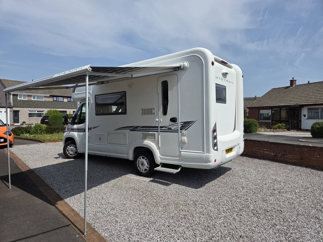 Externally, we have a motorised habitation step, a wind-out awning, with a very smart chequered canopy which is ‘as new’ and a garage/storage area for all necessary motorhome accessories and equipment. Additionally, we have a 200W solar panel and two large leisure batteries.
