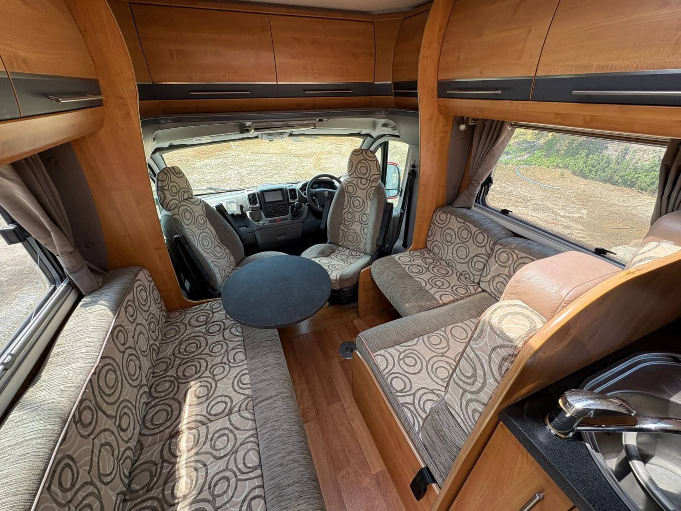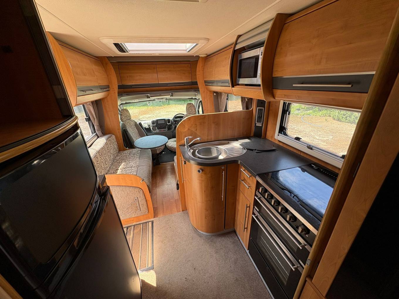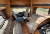Mid habitation is the kitchen which is made up of 3 gas hobs, 1 electric hot plate, wash basin sink with hot and cold water, new 3-way fridge with freezer space, oven, separate grill, microwave and plenty of storage including 2 large wardrobe areas. Finally, towards the front of the Cherokee we have the spacious dinette area made from one forward facing bench and a small side seat. This area also houses two additional 3 point seats belts and can be made into a seating area easily big enough for 4 by swivelling the front driver and passenger seats to face into the living area.