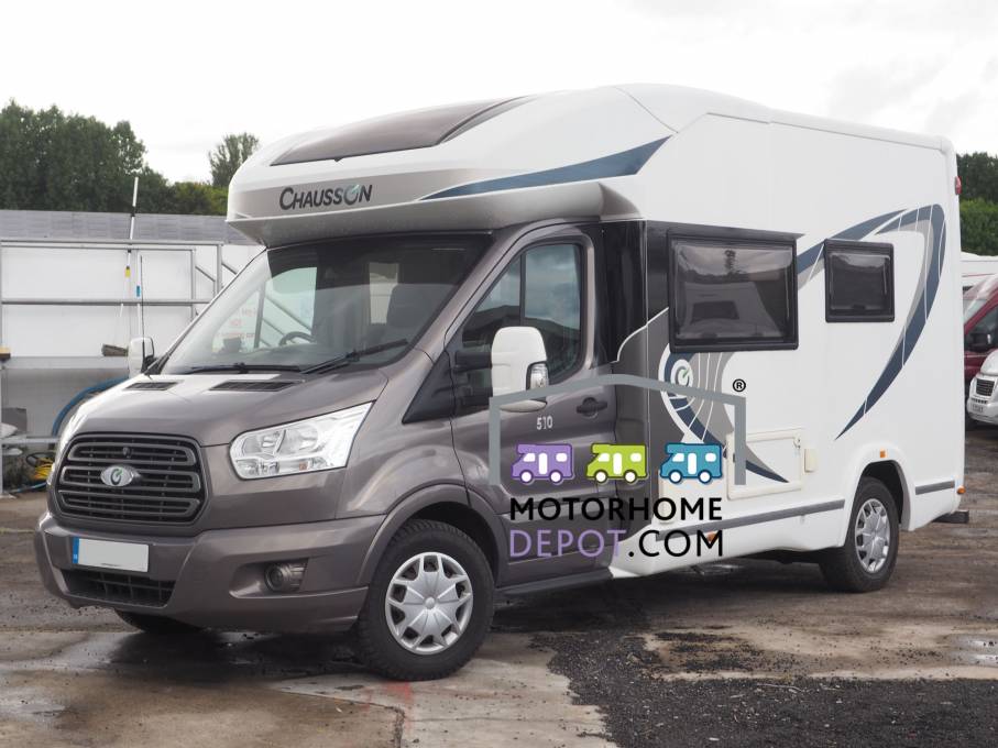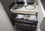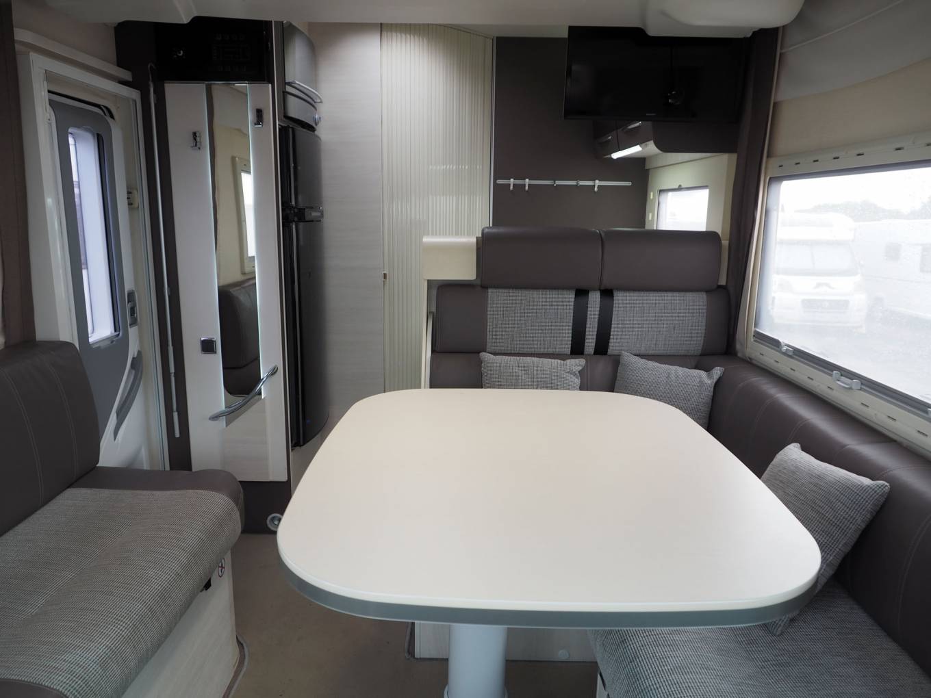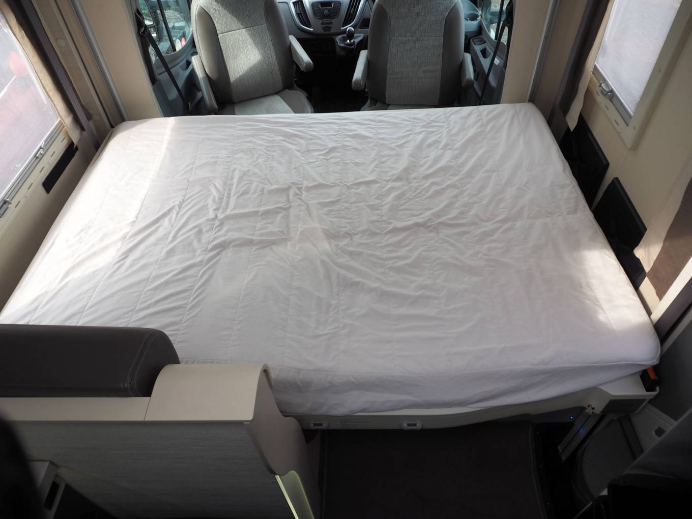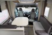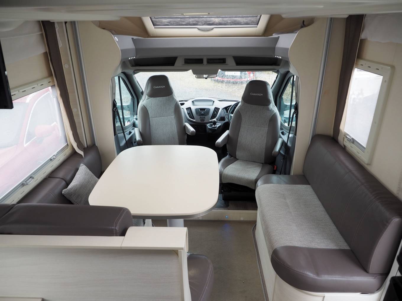 The Chausson is easy to drive on the front wheel drive Transit chassis and the cab area is pleasing to use with steering wheel media buttons, cruise control, cab air conditioning and reversing camera. Integrated cab blinds are fitted for quick privacy screening at nightime.
