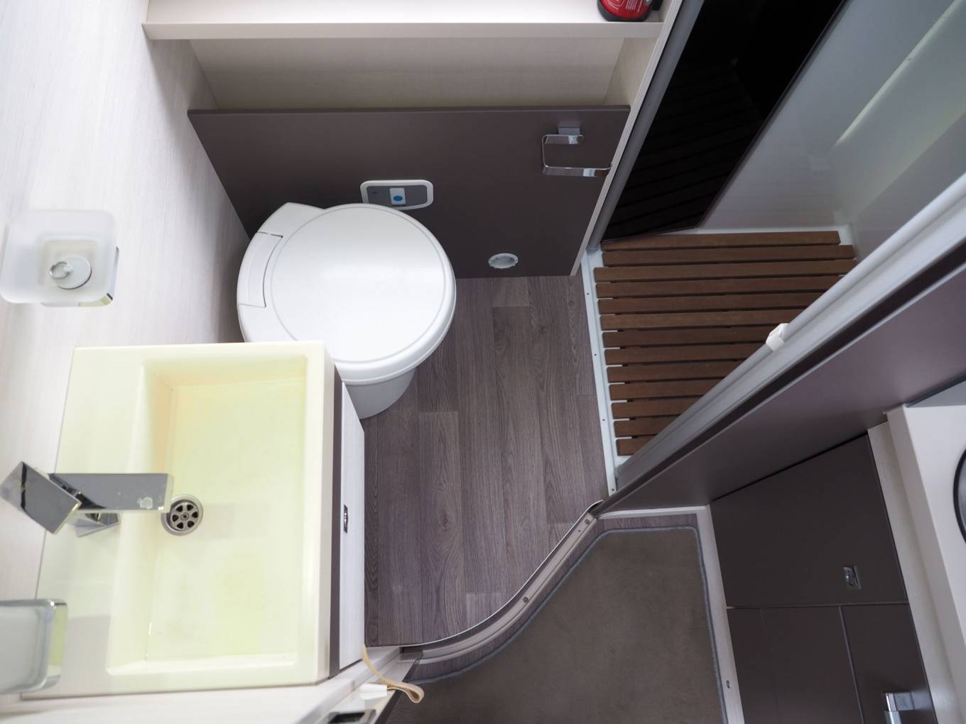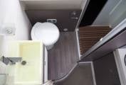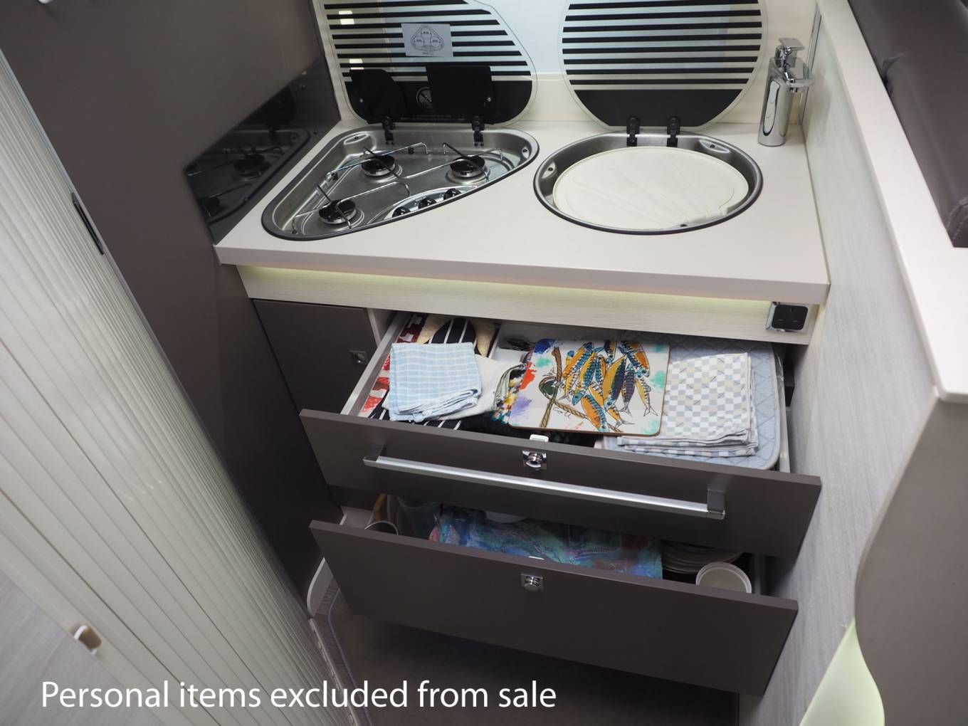Onboard systems include fresh and waste water tanks, dual fuel hot water, diesel room heating, full kitchen with fridge freezer, gas hob, oven and grill, washroom with toilet, vanity sink and shower. The upper bed lowers electrically with options for a low or high bed, depending on whether the secondary bed made up from the dinette is being used.