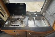 The well-equipped kitchen features a large fridge/freezer, a 3-ring gas hob, and generous storage, making meal prep on the road a breeze. Truma all-season heating keeps the interior warm and comfortable year-round, no matter where your journey takes you.