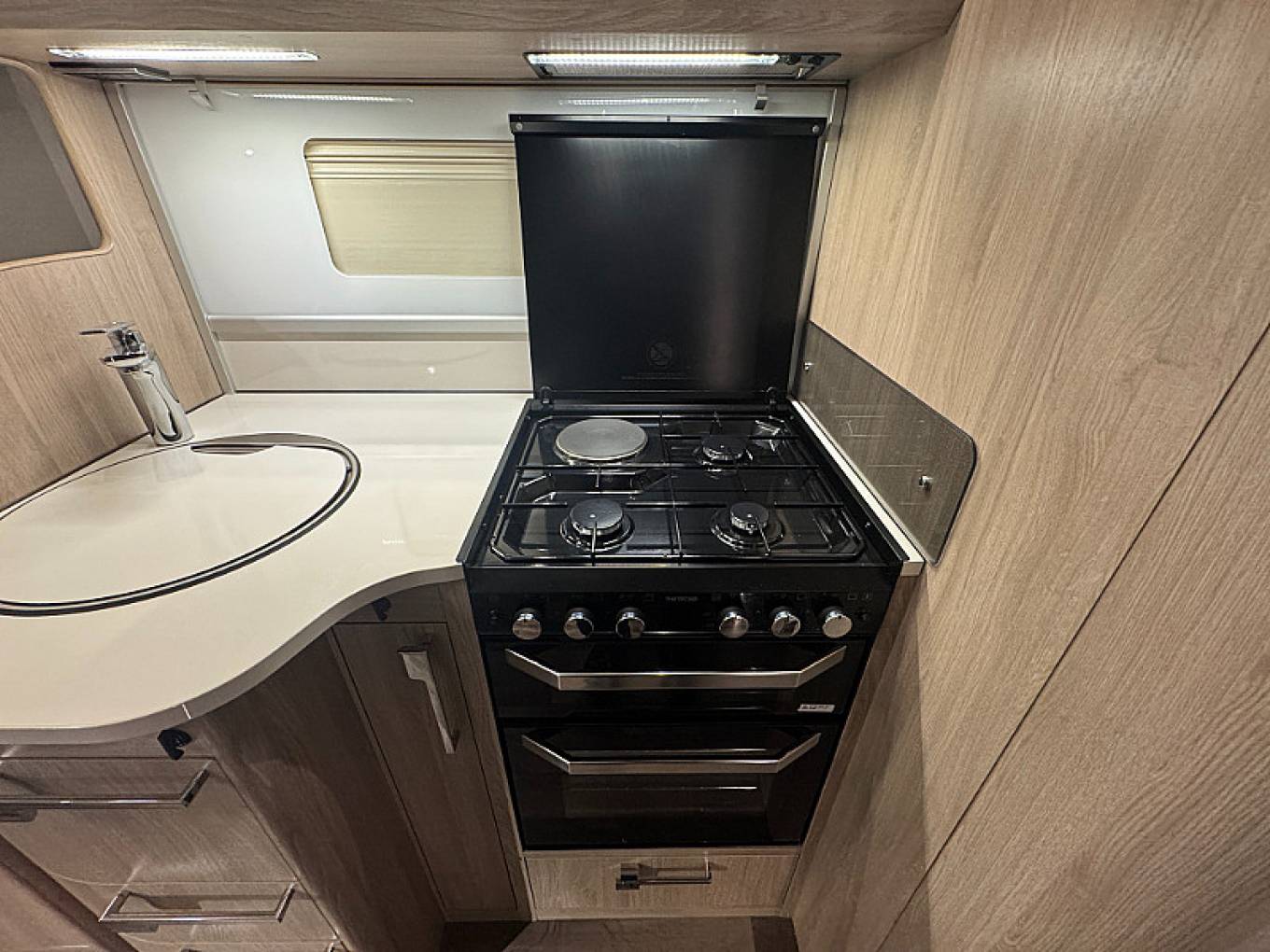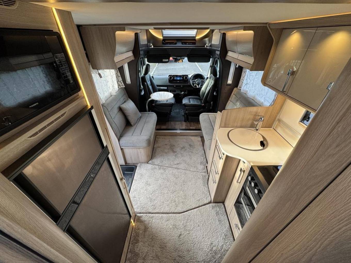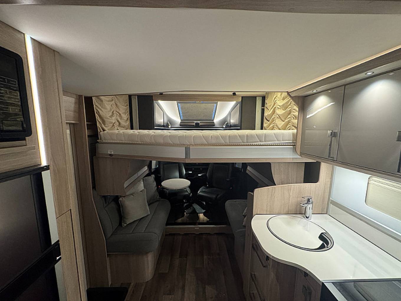 This is a wonderful luxury 4 berth motorhome with 4 travelling seat belts that gives you everything you could need for fantastic trips away. Coachman is a name synonymous for quality and this is reflected across throughout the motorhome. It is exception stylish and has a real sense of space and comfort. The main features include a very spacious front lounge, well equipped kitchen, very large rear Island bed plus a further electric drop down bed, good sized washroom with separate shower. This is a genuinely an all year round motorhome with the both cab and habitation air conditioning to keep you cool in summer and the excellent Alde heating system, including under floor heating and heated tanks to keep you warm in winter. The motorhome is built on the superb Mercedes Sprinter Chassis and has the 9 speed auto engine with 170 BHP - making it a pleasure to drive. It comes with loads of storage throughout including a very large garage (door 100cm x 70cm) and a generous payload.