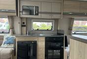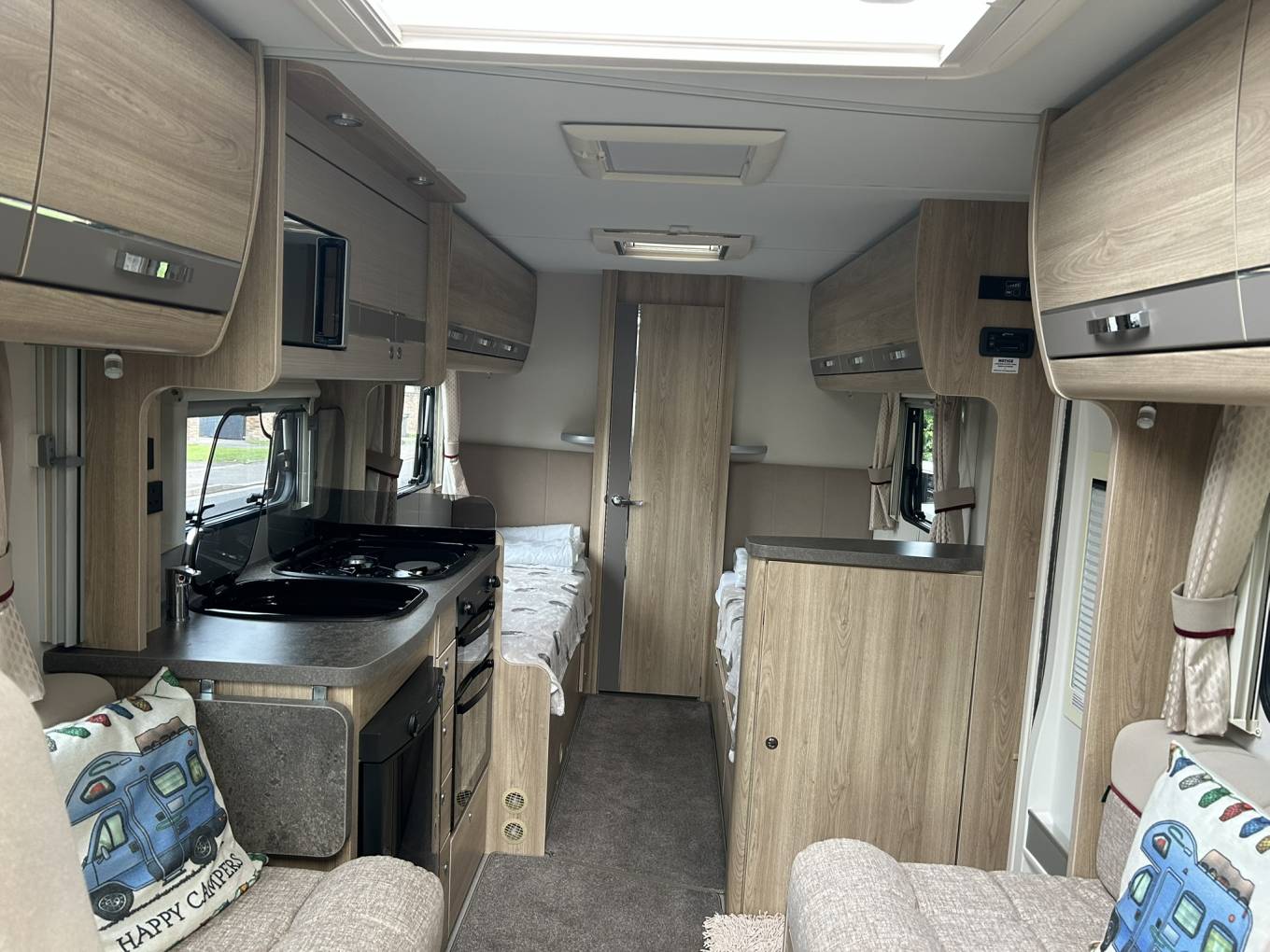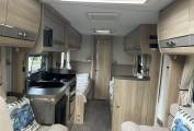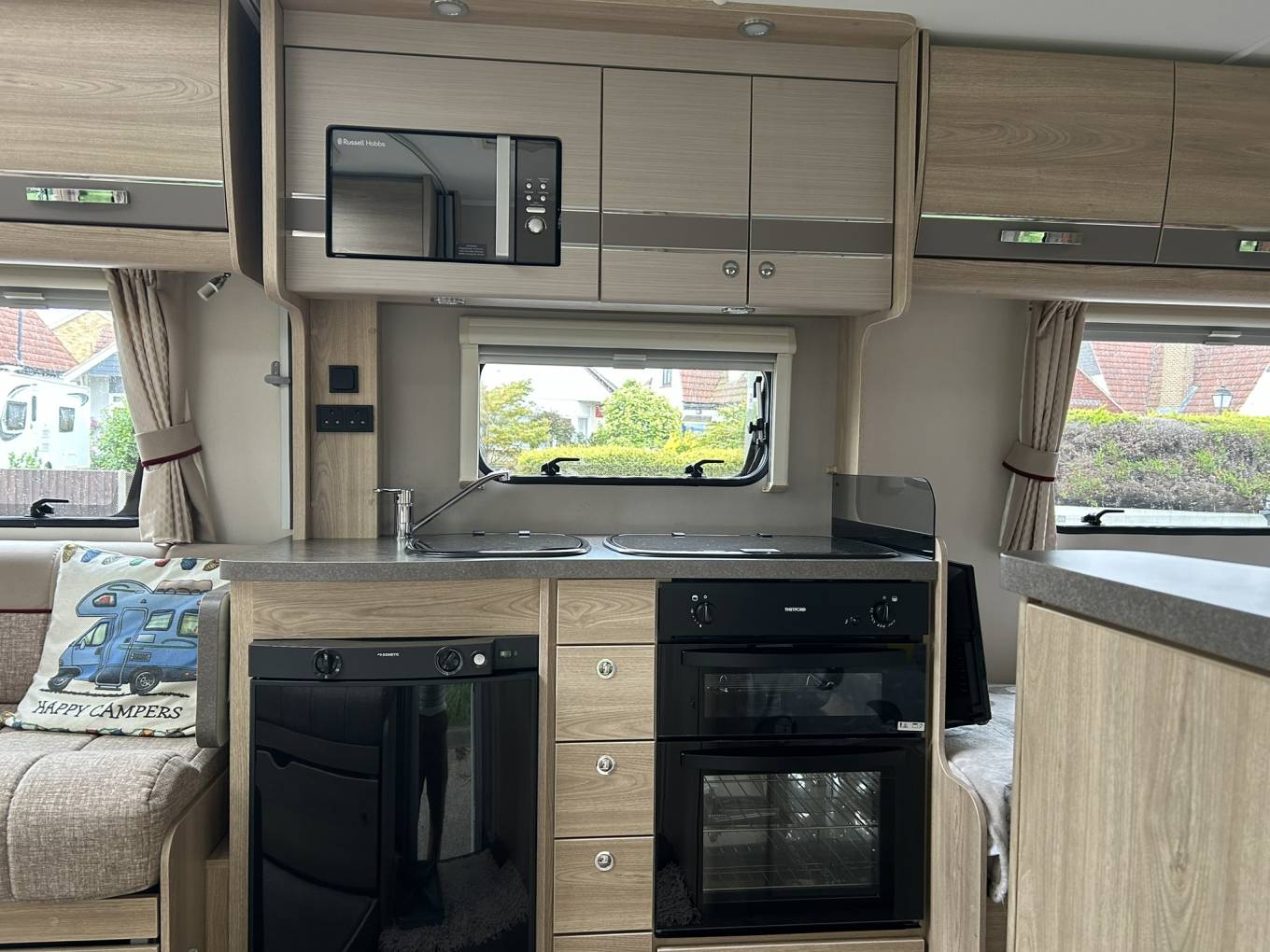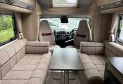 As you enter the motorhome you will find a well equipped kitchen comprising of a fridge with freezer compartment, duel fuel hob, oven, grill, microwave and a sink with mixer tap. There is plenty of storage for all your kitchen essentials.
