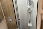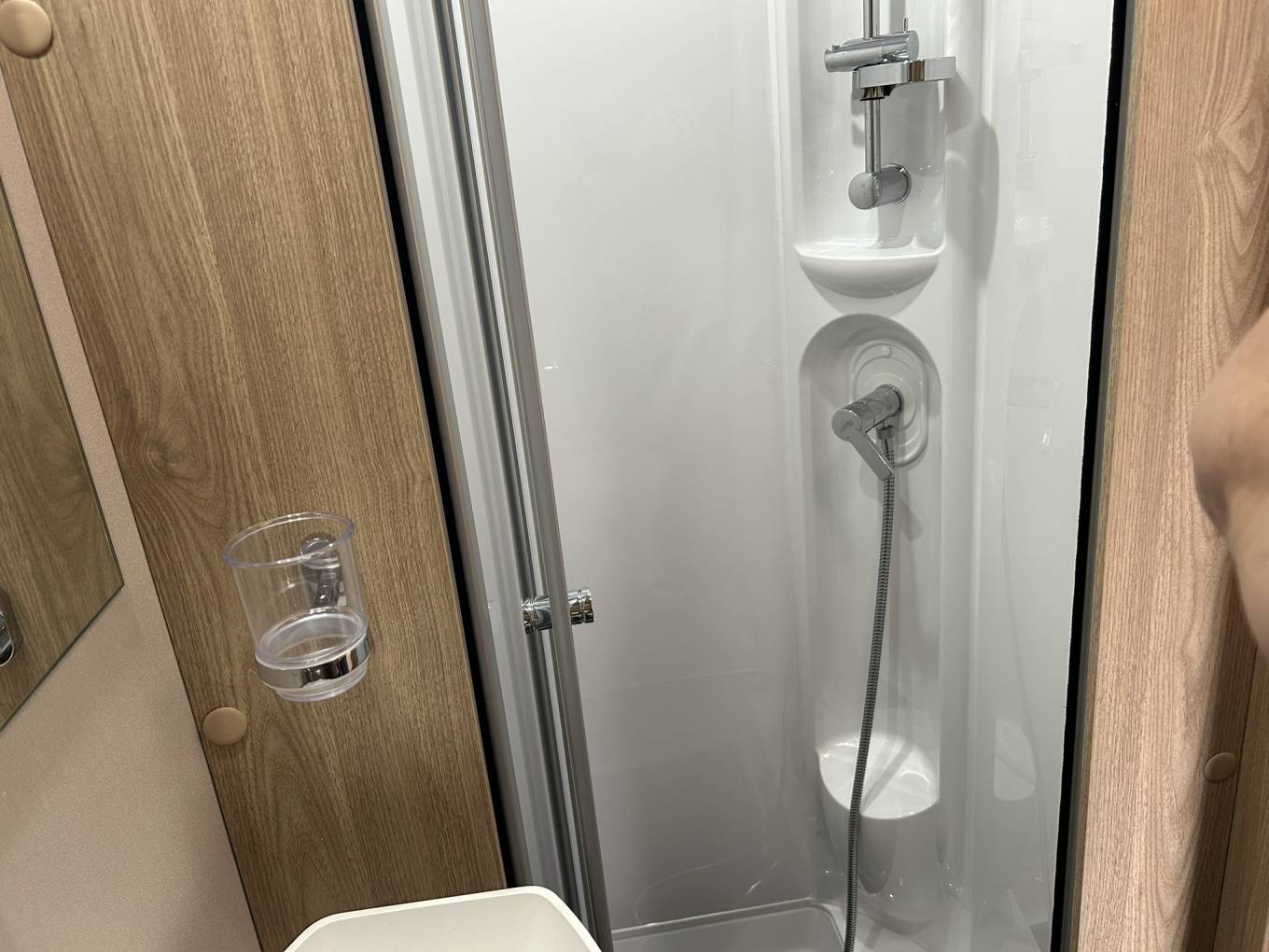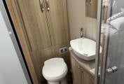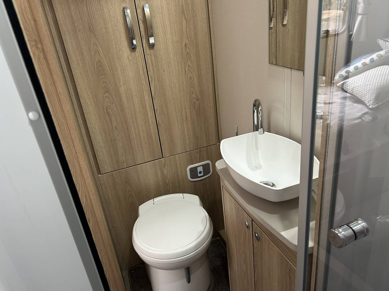 At the rear is a large washroom consisting of a shower cubicle, vanity unit with hand basin, cassette toilet, mirror and a wardrobe.