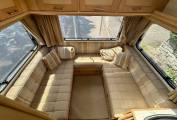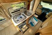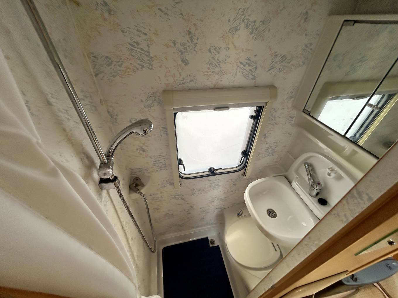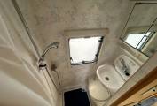 The U shaped rear lounge, with three panoramic windows and large skylight above, is one of the main features of this motorhome, offering a fantastic social and dining space which easily converts to a good sized double bed and a free standing table for meal times. Moving forwards there is a well appointed washroom, which has a Thetford cassette toilet, integral shower, fold down wash hand-basin, mirror and opening opaque side window. The central habitation door is adjacent to the galley kitchen which includes a three gas burner hob below which is the grill and combination oven, a Dometic three way fridge with integral ice box. Above this is a good sized rectangular sink with mixer tap and storage. Additional fold out work surfaces give options for food preparation. All windows and skylights have blinds and flyscreens and there is plenty of cupboard and storage space throughout.