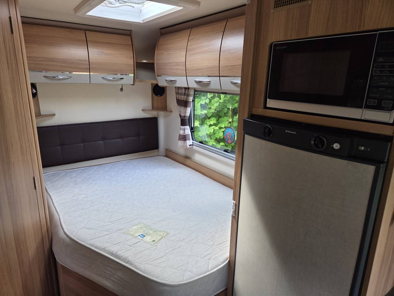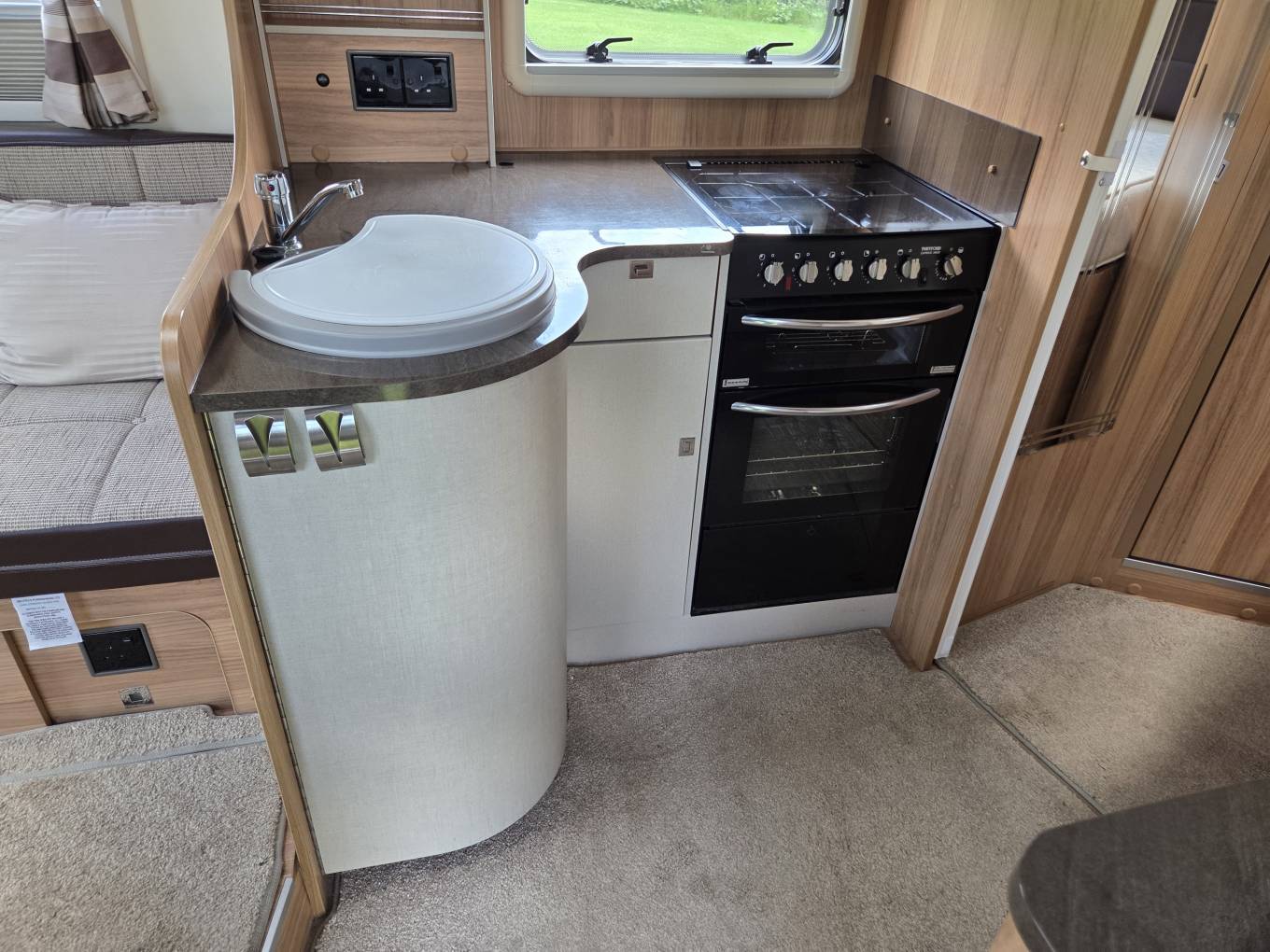 In the centre of the van, you will find the kitchen area. There is a full size ‘dual fuel’ cooker offering oven, grill, 3 gas burners, and 1 electric hotplate. Additionally, we have a round stainless steel sink, utensil drawer, cupboards underneath and above as well as ample worktop space. Opposite the kitchen, we find the built in microwave oven and a good size fridge-freezer.