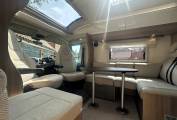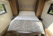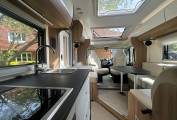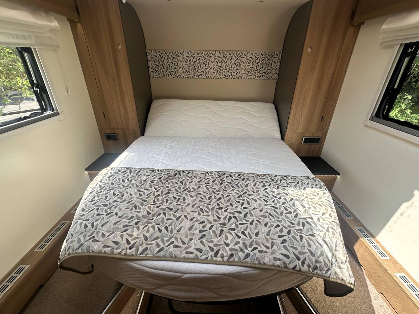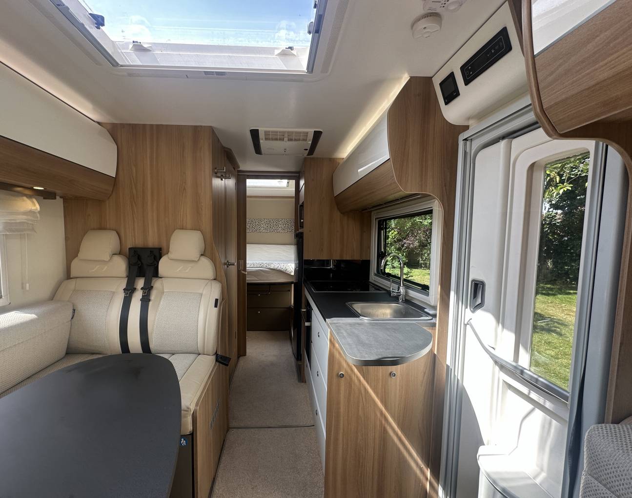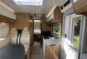 This popular layout consists of the rear bedroom with an adjustable Island bed, ample storage, including wardrobes on either side of the bed, eye-level lockers, and under-bed storage. There is plenty of room to move around the bed, and the two side windows and skylight provide plenty of light.