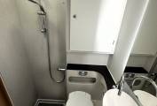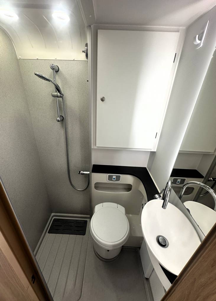 Centrally situated you will find the Washroom with a flushing cassette toilet, sink with mirror, storage and a separate shower cubicle.