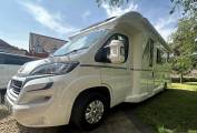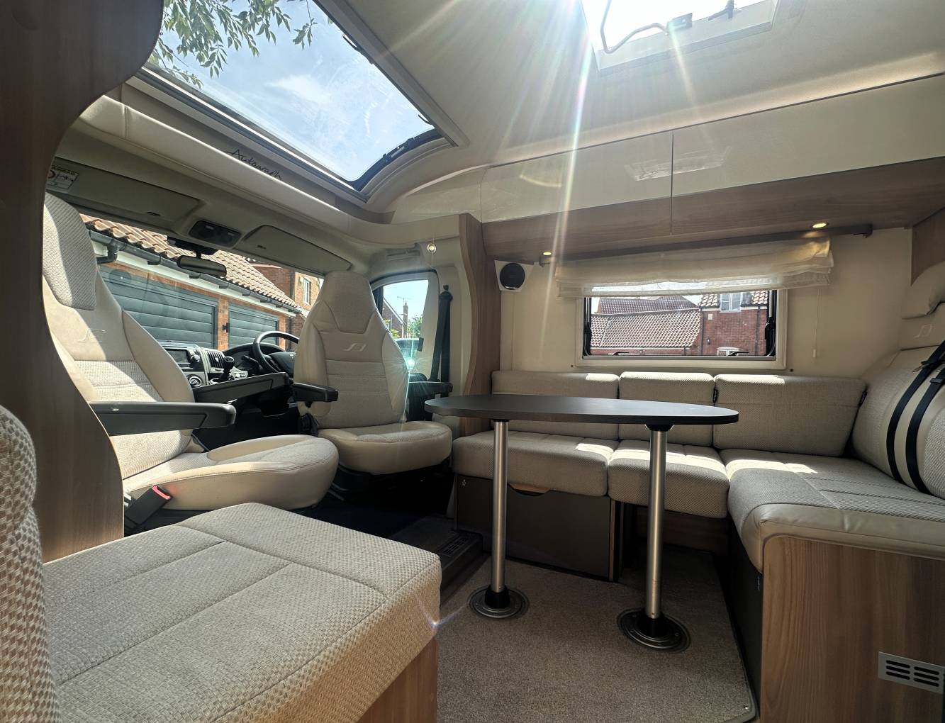 The motorhome comes with cab air con, cruise control, reversing camera, sat nav, Bluetooth, Remis front cab blinds, part leather upholstery, solar panel, TV, aerial, Alde wet central heating and hot water system, tow bar, wind out awning, gas bottle and external gas bbq point.