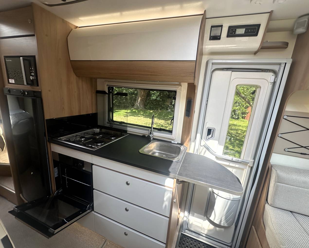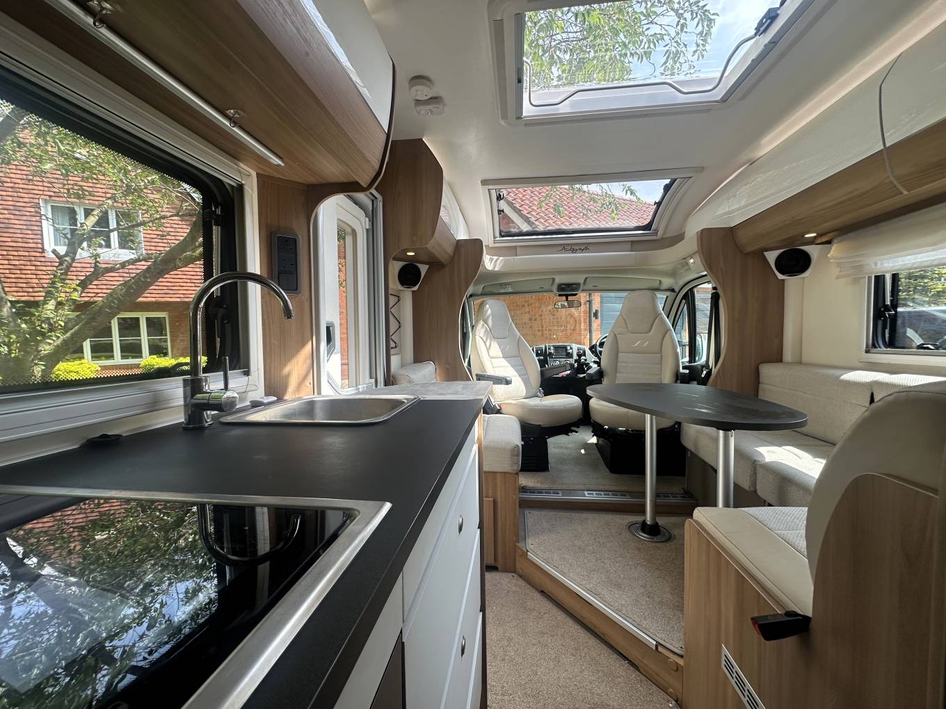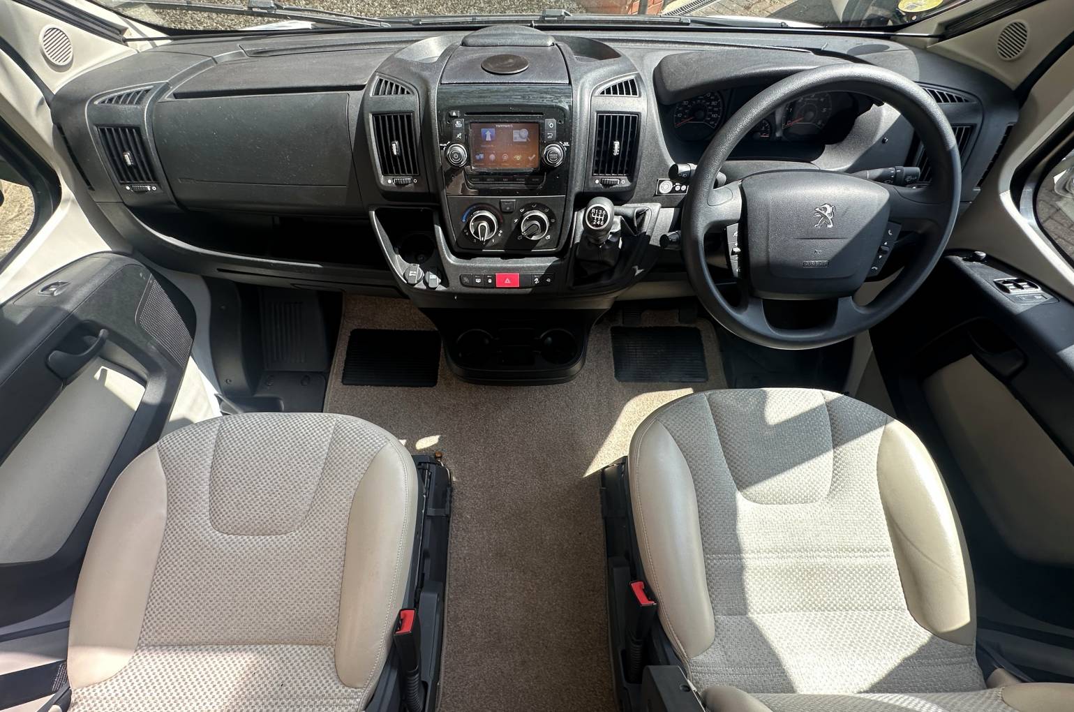 The vehicle is based on the 2ltr Peugeot engine with 160 BHP and a 6-speed manual gearbox. The mileage is showing at just over 25,000 miles and comes with an impeccable MOT which is valid until September 2025 with no advisories. The motorhome comes with a comprehensive history with the latest service being completed in June 2024 and the latest habitation check will be completed in July. The motorhome measures 7.9 metres in length and has a GVW of 3850kg which will require a C1 UK driving licence.