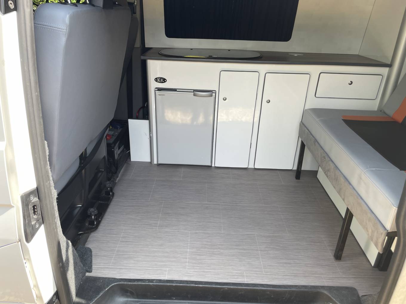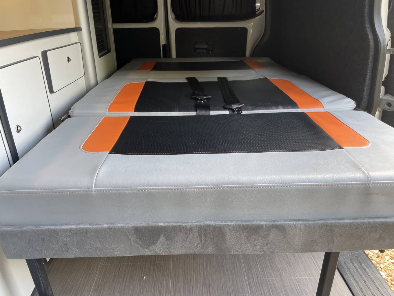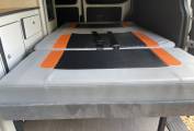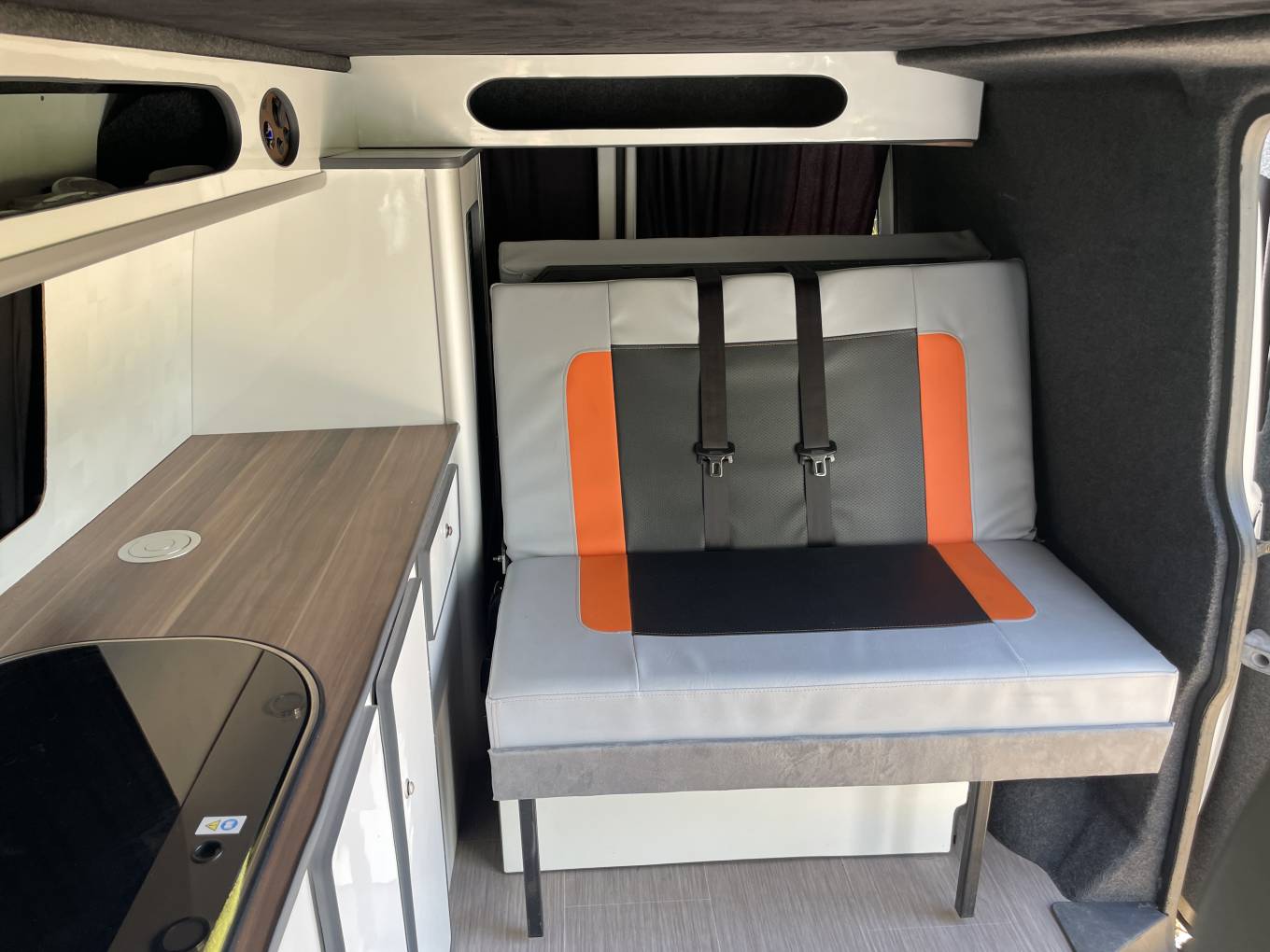 This is a 2011 Volkswagen T5 campervan, a professionally converted four-berth van with plenty of character and practicality. Inside, the quality of the conversion is clear, with the seats and bed all fished in a great modern looking grey with orange and black, it offers a smart use of space with sleeping arrangements for four, and all the essentials you need for life on the road with double hob, sink, fridge freezer and led lighting this great camper is set up to either run on electric hook up or the 110amp leisure battery; everything for camper van life!