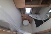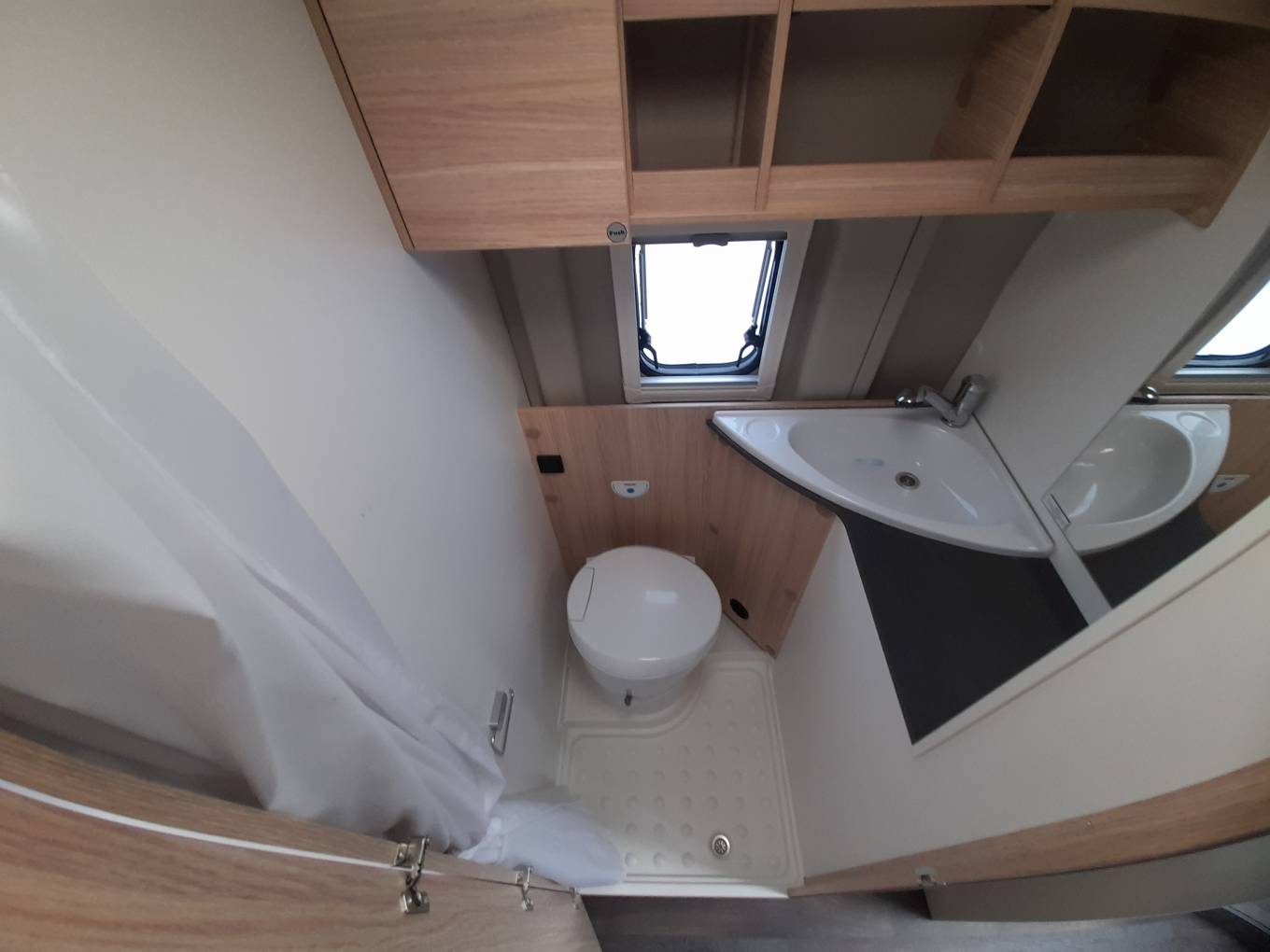 Washroom - Electric flush cassette toilet - Sink – Shower with curtain.