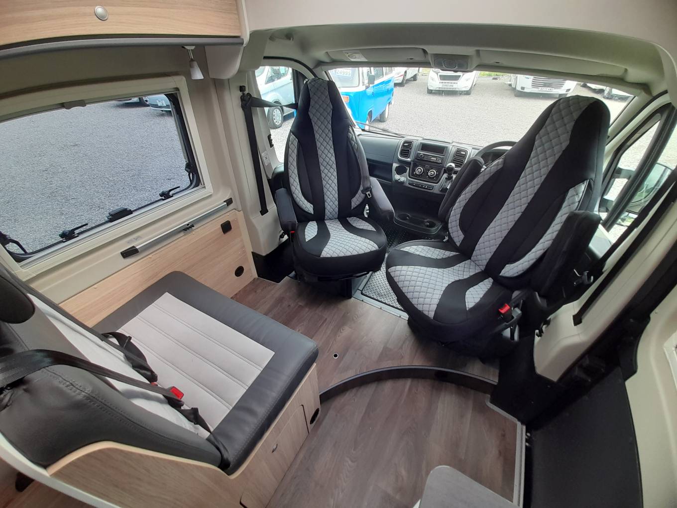 Living – Forward seating, to 2 belted travel seats, Cab seats with arm rests and swivel bases, blinds and fly screens on all windows Electric and Gas Blown air heating.