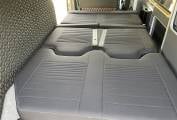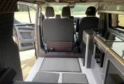 This model comes equipped with twin sliding side doors for easy access and improved ventilation, a rare and valuable feature in camper conversions. The sleek pop-top roof allows for extra headroom and sleeping space, making it ideal for family getaways or extended road trips. The large Fiamma F45S awning extends the living area outdoors, providing instant shade and shelter for all-weather enjoyment.