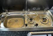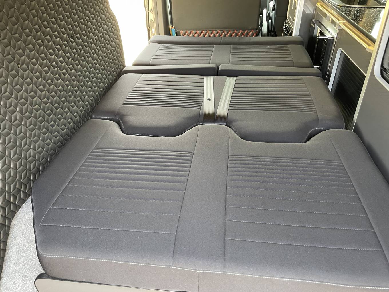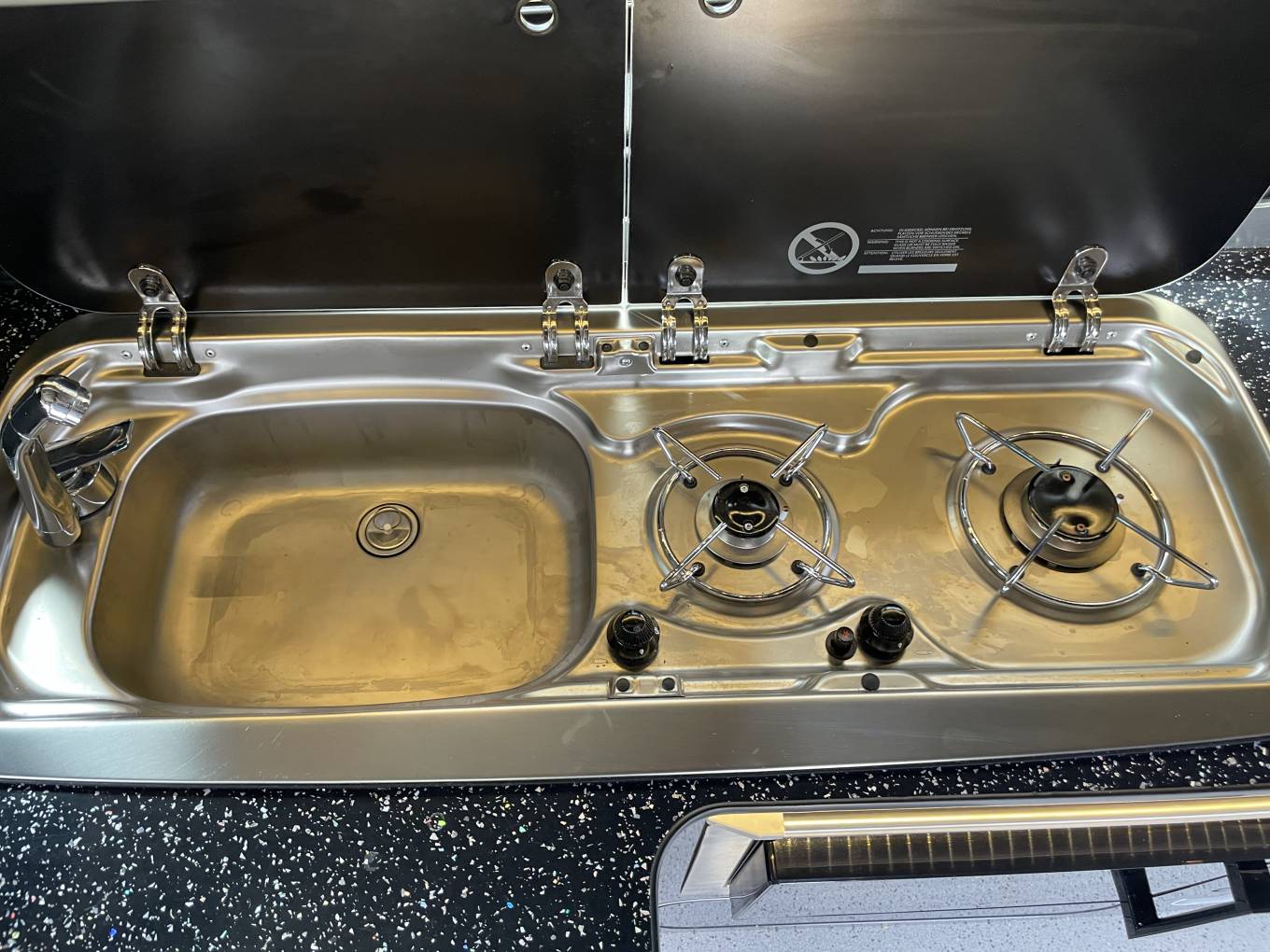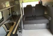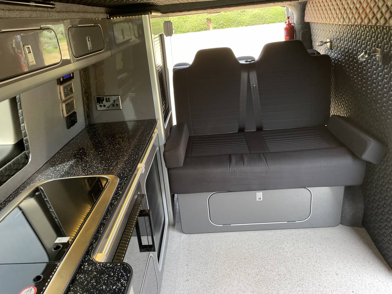 Inside, the van is fitted with a modern, high-gloss kitchen unit featuring a built-in hob, sink, and fridge, alongside a compact microwave for added convenience. The rock and roll bed converts easily to a comfortable double, with smart storage solutions integrated throughout the space. Power needs are handled efficiently thanks to the installed inverter, allowing off-grid adventures with the comforts of home.