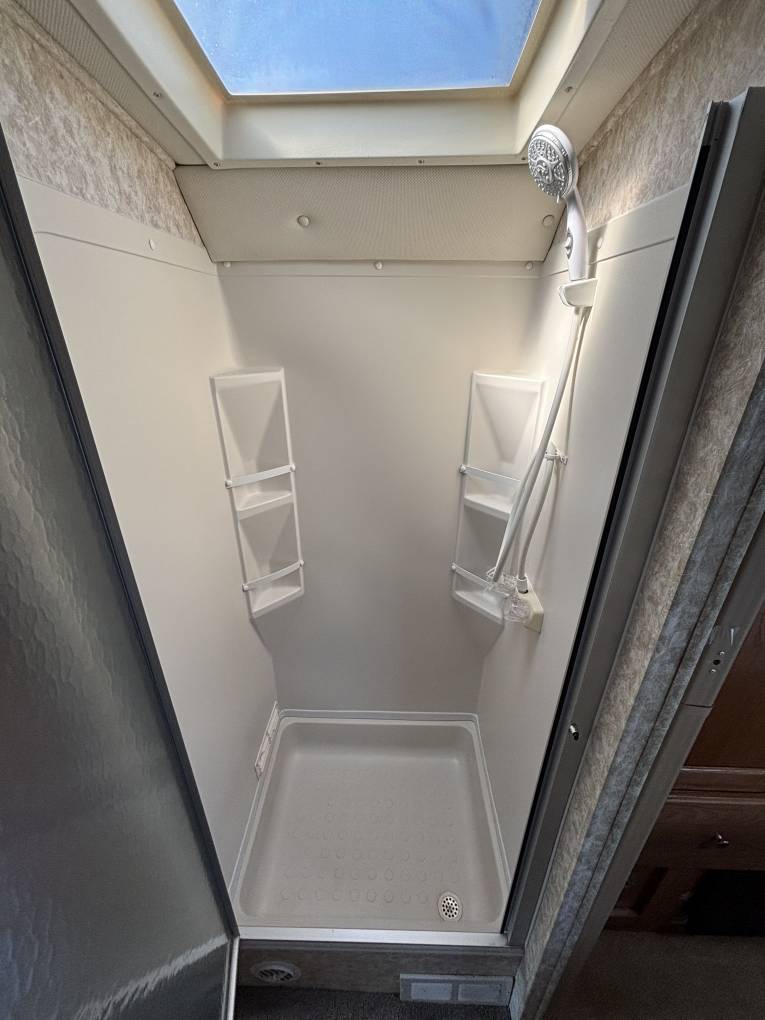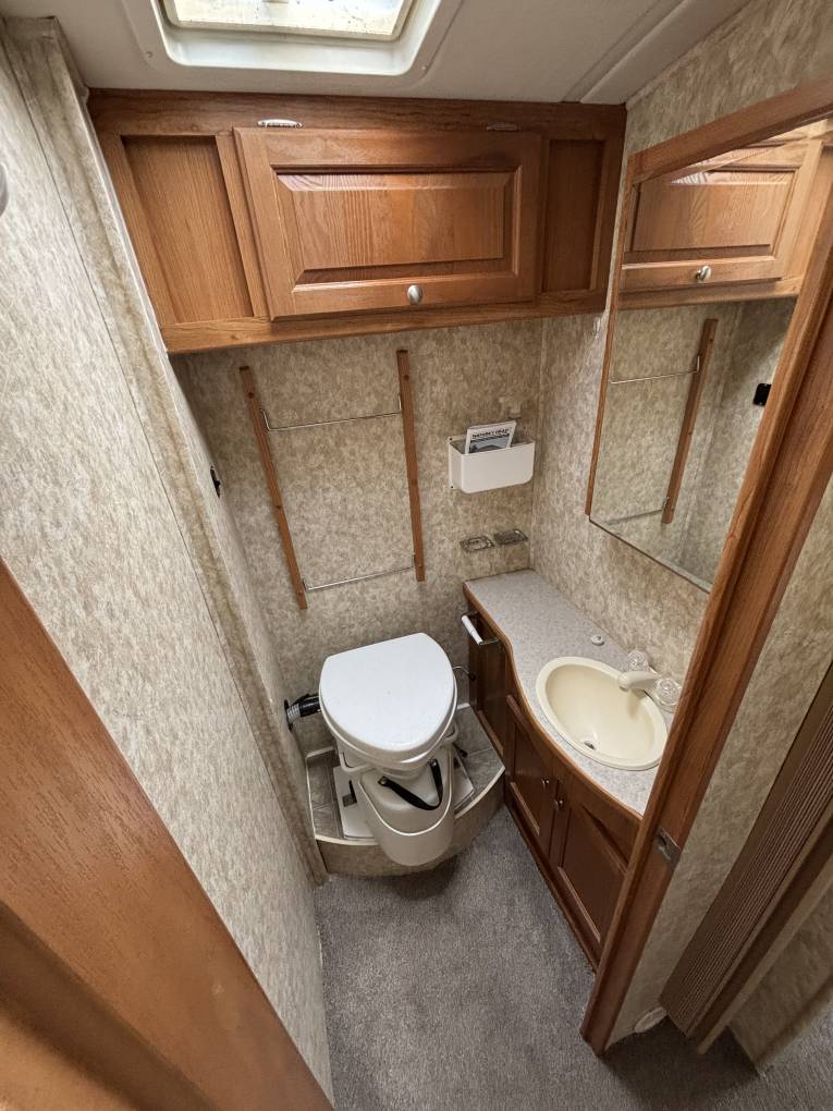Moving further forward you will find the bathroom to the left complete with Nature head composting toilet, wash basin, vanity mirror and medicine cabinet. To the right you will find the huge separate shower cubicle.
