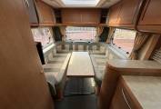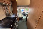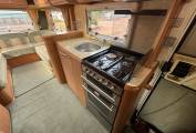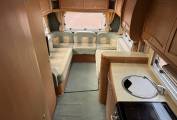 Entry is via an electric step into a very light and airy and particularly spacious living area to the right with the huge "U" shaped lounge at the very rear. The lounge area has a large collapsible table able for 2 to 6 people for dining, relaxing or socialising. There are windows all around this area and a skylight which adds to the feeling of space. The lounge area converts very easily into a large double bed and the other sleeping accommodation is the large area above the cab which has a large double bed with a safety net, light and a window at either side.