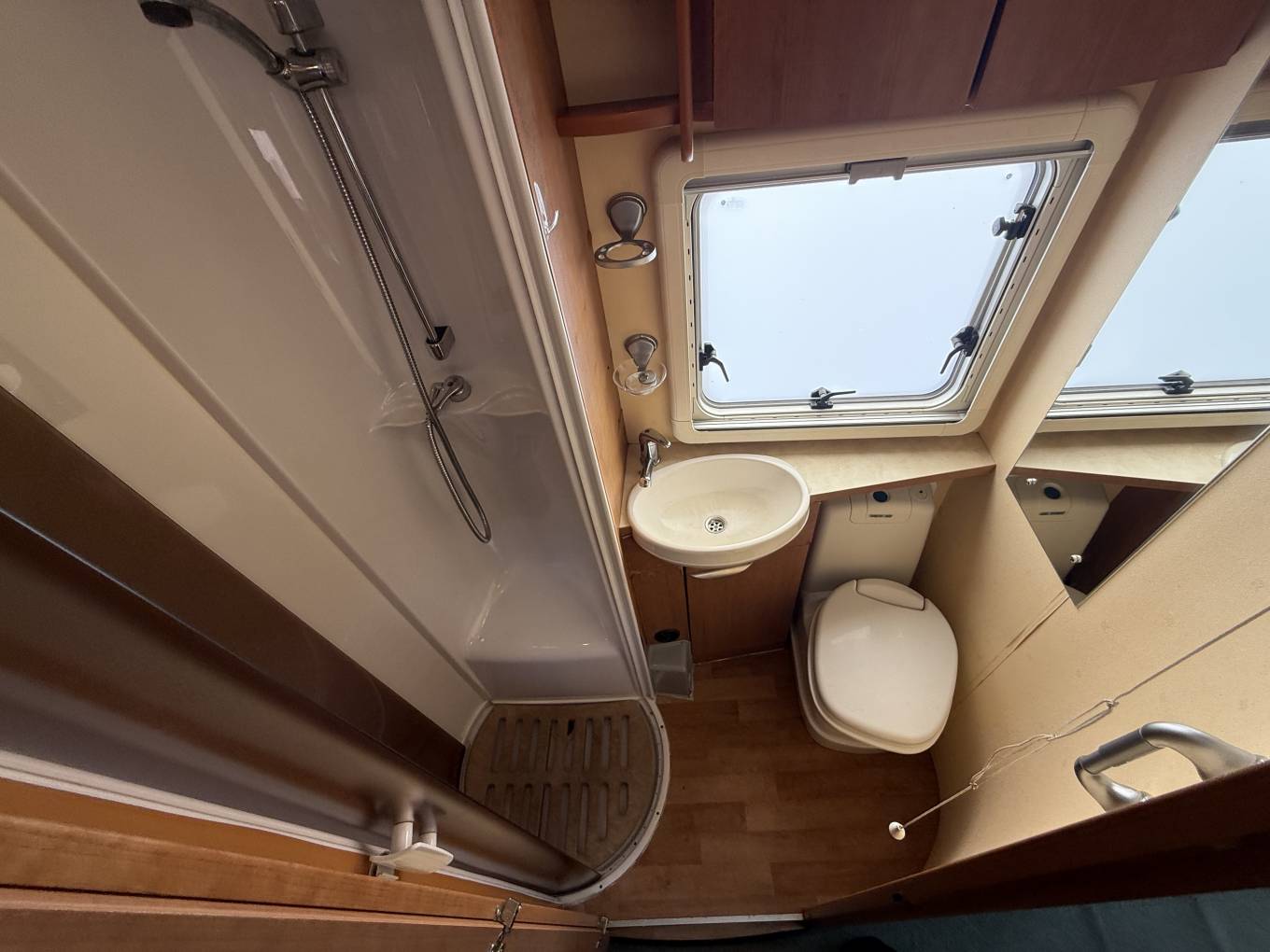 The kitchen area is particularly well kitted out with 3 gas hob, electric plate, grill, oven and fridge /freezer. There is lots of storage space throughout the vehicle including a wardrobe with hanging rail and storage for the large collapsible table mentioned above. The washroom is very well designed with w.c. and vanity unit and washbasin but it also incorporates a separate full height shower unit with a sliding round door to isolate from the rest of the washroom.